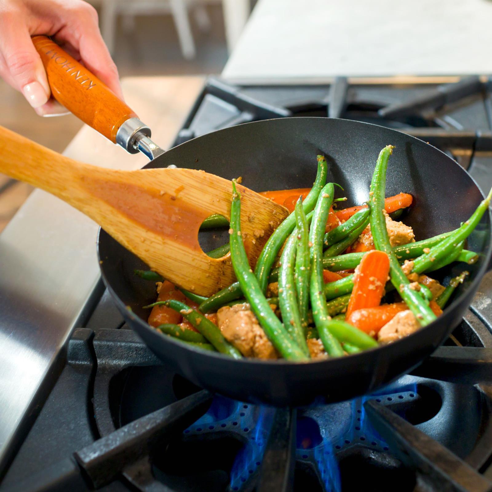 Um mit dem Kochen zu beginnen, stellen Sie den Wok mittig auf der Herdplatte ab und erhitzen ihn vorsichtig mit etwas Speiseöl. Sobald das Öl heiß ist, fügen Sie Ihre ausgewählten Zutaten hinzu. Sie müssen aufgrund der Antihaftbeschichtung das Kochfeld nicht auf volle Hitze einstellen. Wichtig ist, dass Sie während des Kochens weiter rühren und wenn das Essen brutzelt, gart es schnell und gleichmäßig.