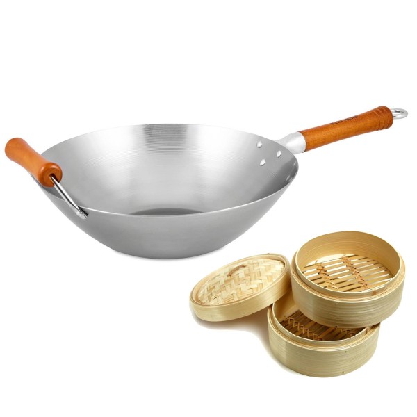 Produkt-Eigenschaften des Karbon-Wok Sets✓ Der unbeschichtete Wok 32 cm aus gehärtetem Karbonstahl eignet sich optimal für hohe Temperaturen