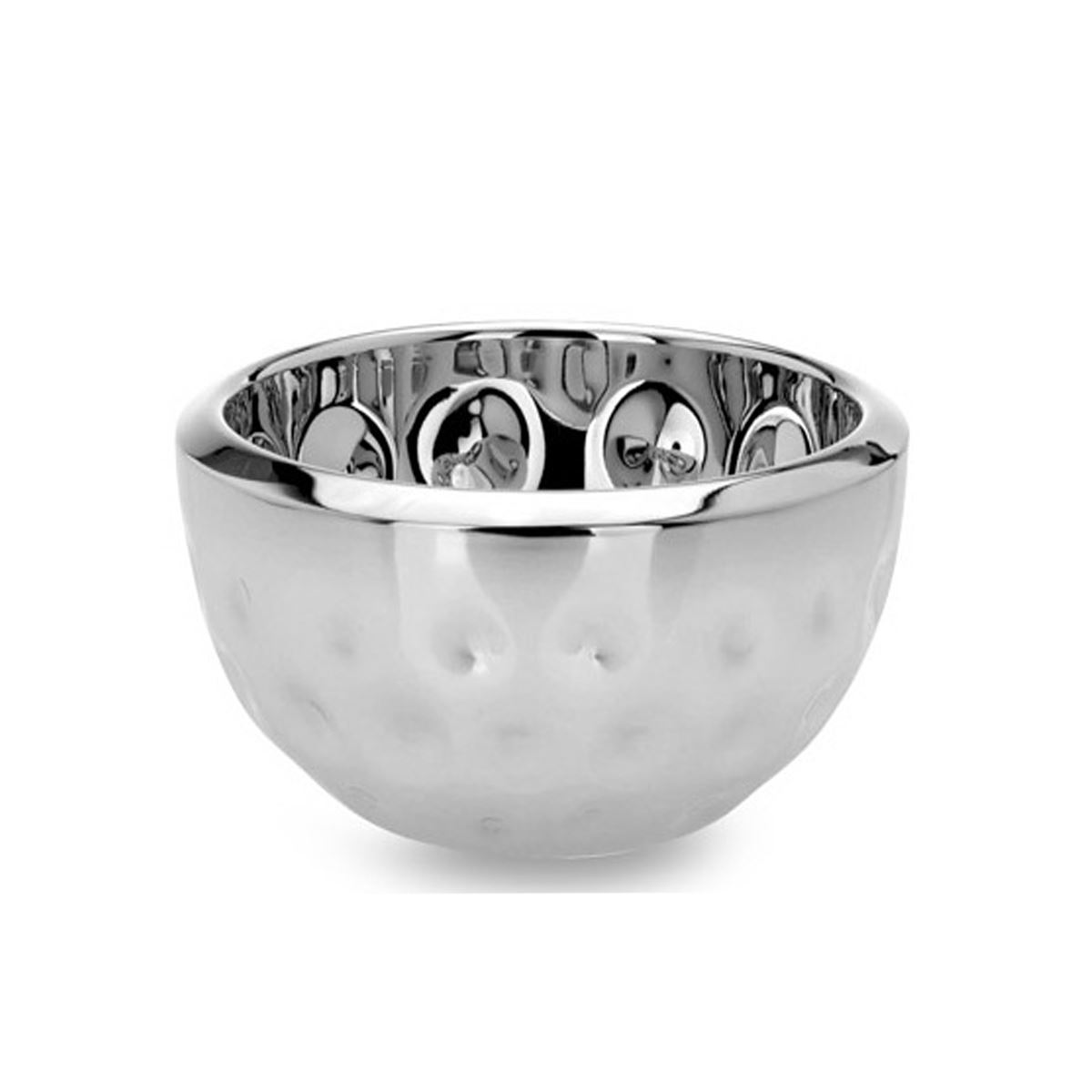 • Höhe ca.: 8.5 cm • Durchmesser ca.: 15 cm • Innenmaß ca.: Ø 13 cm • Randbreite ca.: 1 cm • Volumen: 500 ml • Ausführung: hoch • Material: Edelstahl • Oberfläche: glatt poliert • Oberfläche Details: gehämmert • spülmaschinengeeignet: ja • Farbe: silber • Eigenschaft: ohne Griffe - ohne Füße • Ausstattung: hoher Rand • Funktionalität: Zum Anrichten und Servieren von Süßigkeiten und Gebäck • Platzierungsart: Zum Aufstellen auf dem Tisch • Form: rund • Dimension: klein • Symbolik: Symbol für Wertschätzung, feinen Genuss & kleine Rituale • Look & Stil: fein schimmernd, dezent, klar geführt, pointiert, charmant • Umgebungsnutzung: Für Innenbereich und geschützten Außenbereich • Anlass: Für Kaffeezeit, Besuch, Festtafel, Empfang, Geschenkidee • Nutzungsbereich: Esstisch, Kaffeetisch, Theke, Empfangsbereich, Sideboard • Nutzungsmöglichkeit: Pralinen präsentieren, Süßes servieren, Gebäck anbieten • Gewicht ca.: 0,376 Kg