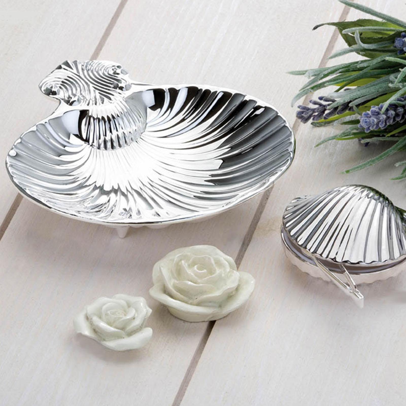 • Länge ca.: 12 cm • Breite ca.: 12 cm • Material: Metall • Beschichtung: versilbert • Veredelung: anlaufgeschützt • Oberfläche: strukturiert • spülmaschinengeeignet: nein • Farbe: silber • Funktionalität: Zum Anrichten und Servieren von Snacks • Platzierungsart: Zum Aufstellen auf dem Tisch • Form: rund • Dimension: klein • Motiv: Muschel • Symbolik: Symbol für Genuss, Schönheit & maritim-elegante Lebensart • Look & Stil: Glänzend, organisch, stilvoll, auffallend, charakterstark • Umgebungsnutzung: Für Innenbereich und geschützten Außenbereich • Anlass: Für Party, Filmabend, Empfang, Treffen, Zwischenmahlzeit • Nutzungsbereich: Esstisch, Couch, Buffet, Lounge, Konferenztisch, Gastronomie • Nutzungsmöglichkeit: Snacks servieren, Portionshäppchen anbieten, anrichten • Gewicht ca.: 0,185 Kg