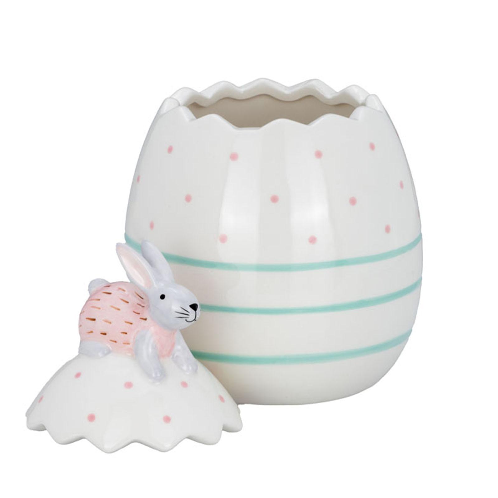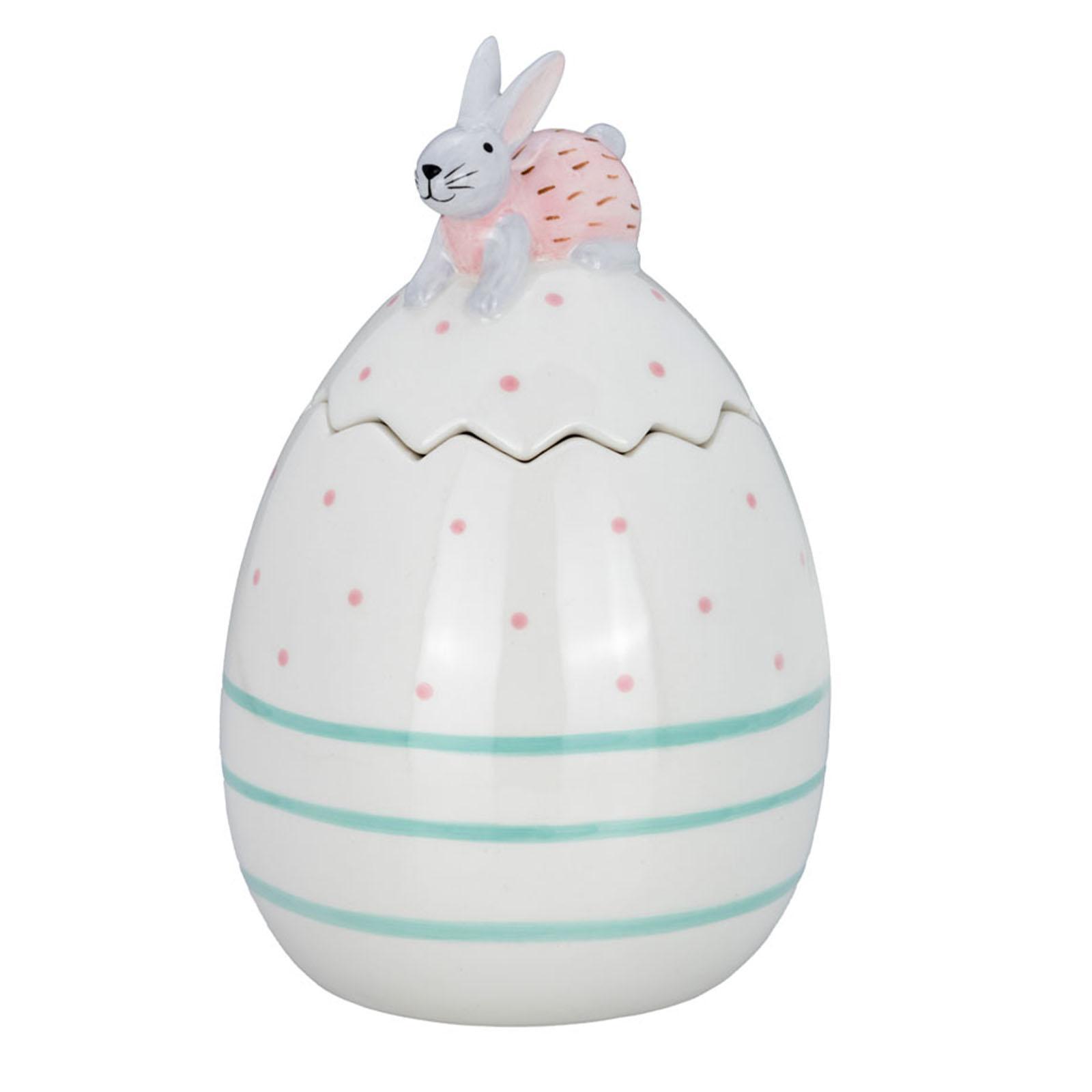 • Länge ca.: 13.0 cm • Breite ca.: 13.0 cm • Höhe ca.: 20.2 cm • Durchmesser ca.: 16.0 cm • Material: Keramik • Oberfläche: glatt • spülmaschinengeeignet: nein • Farbe: weiss • Funktionalität: Zum Dekorieren und Aufbewahren von Kleinigkeiten • Platzierungsart: Zum Aufstellen • Form: oval • Dimension: groß • Motiv: Hase • Motiv-Design: sitzend auf einem blauem Osterei • Symbolik: Symbol für Frühling, Schutz und Erneuerung • Look & Stil: Zarte Eleganz trifft auf fröhliche Frische • Setumfang: 2-teilig • Umgebungsnutzung: Für Innenbereich und geschützten Außenbereich • Anlass: Für Ostern, Frühling, Tischdeko, als Geschenk • Nutzungsbereich: Für Tisch, Sideboard, Fensterbank, Frühlingsdekoration • Nutzungsmöglichkeit: Für Süßigkeiten, kleine Erinnerungen oder als Dekoelement • Verwendungshinweis: nur zur Dekoration geeignet - kein Kinderspielzeug • Gewicht ca.: 1 Kg