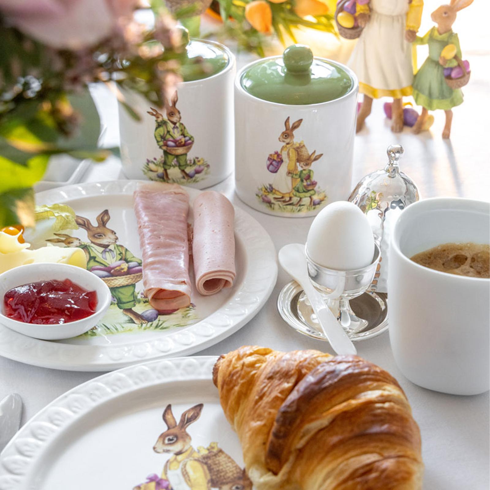 • Länge ca.: 9.2 cm • Breite ca.: 9.2 cm • Höhe ca.: 12 cm • Material: Keramik • Oberfläche: glatt • Oberfläche Details: beidseitig bedruckt • spülmaschinengeeignet: nein • Farbe: weiss-farblich • Funktionalität: Zum Aufbewahren von Süßigkeiten • Platzierungsart: zum Aufstellen • Form: rund • Dimension: klein • Motiv: Hase • Motiv-Design: Hasenfrau & Hasenmann mit Hasenkind • Symbolik: Symbol für Familie, Liebe und Frühlingserwachen • Look & Stil: Charmantes Hasenmotiv für fröhliche Frühlingstage • Setumfang: 2-teilig • Umgebungsnutzung: Für Innenbereich und geschützten Außenbereich • Anlass: Für Ostern, Frühling, Kaffeetafel, Geschenk, Mitbringsel • Nutzungsbereich: Kaffeetisch, Esstisch, Sideboard, Küche, Fensterbank • Nutzungsmöglichkeit: Süßes aufbewahren, österlich dekorieren oder verschenken • Gewicht ca.: 0,802 Kg