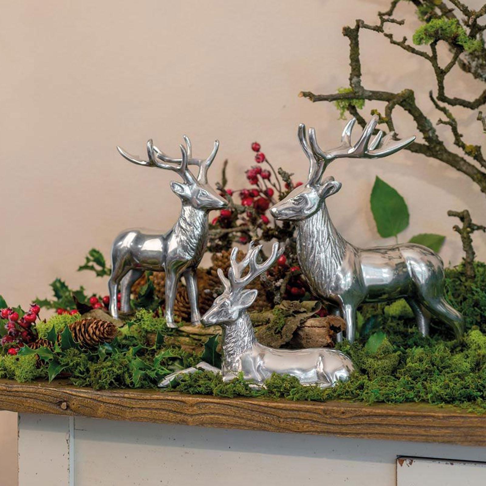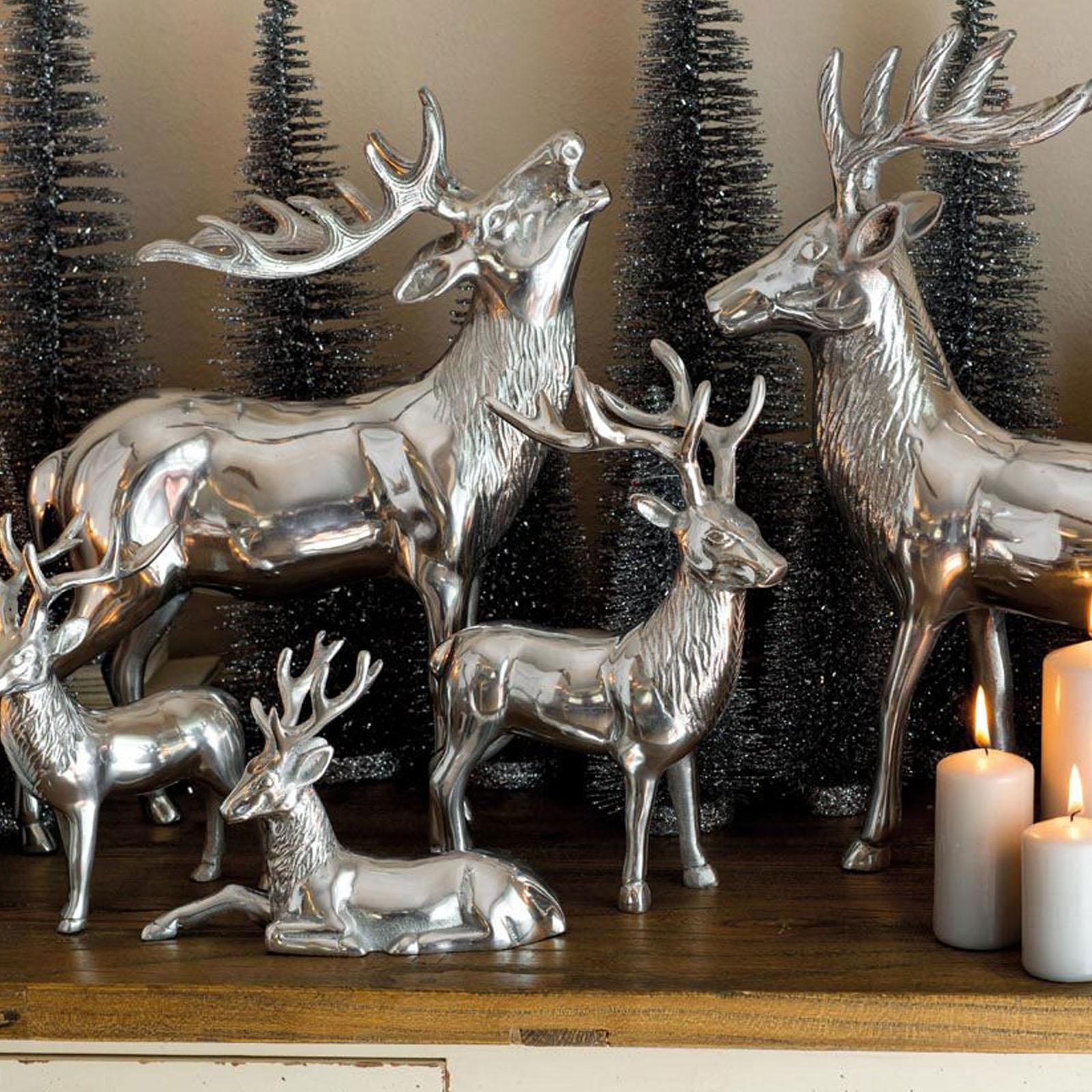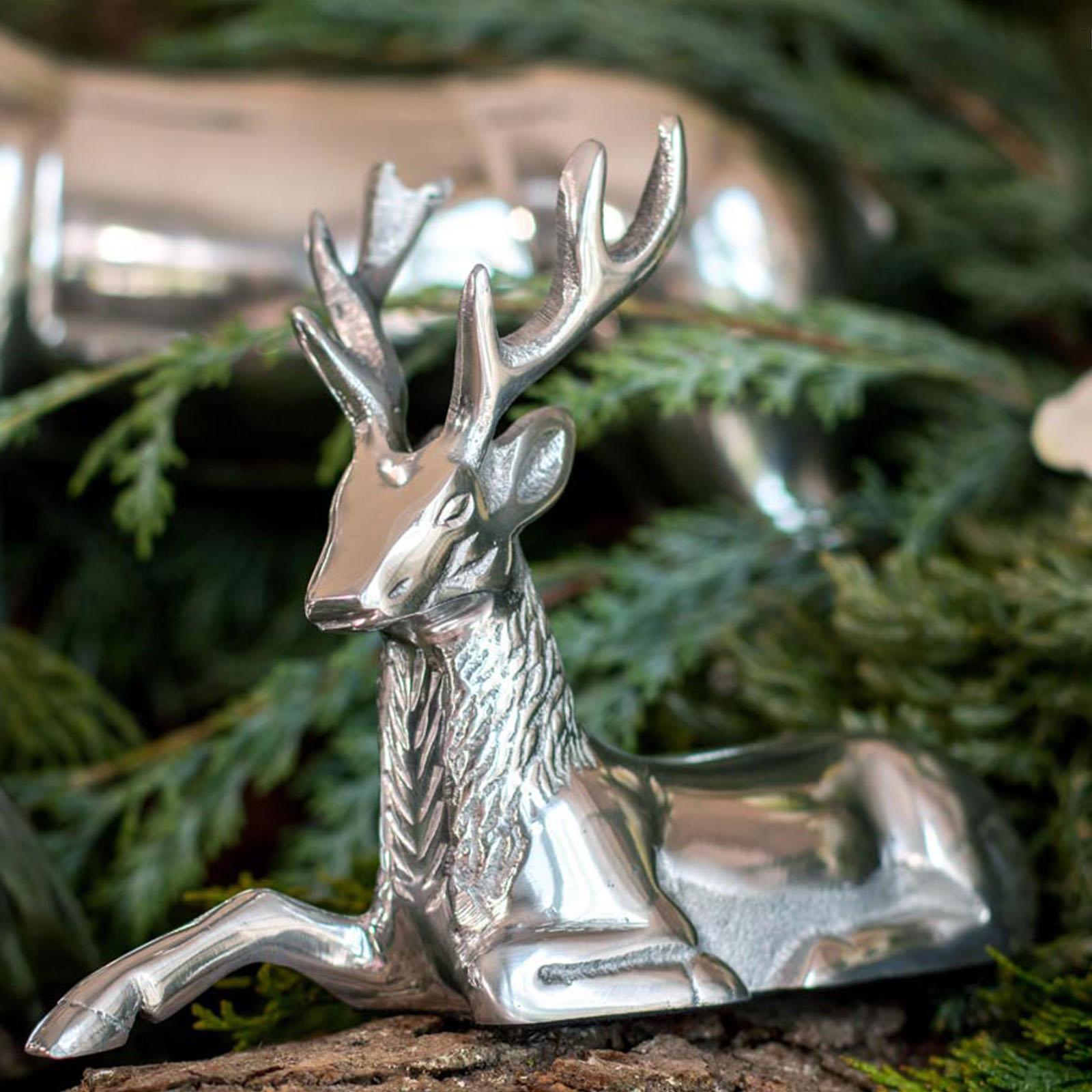 Holen Sie sich einen Hauch von Eleganz in Ihre Dekoration mit dieser exklusiven Hirsch-Dekofigur. Die liegende Figur strahlt mit ihren grazilen Details und der glatt polierten Oberfläche in Silber eine extravagante Präsenz aus. Der Hirsch, mit seinem majestätisch nach oben gerichteten Geweih, liegt entspannt - ein Vorderbein angewinkelt, das andere nach vorne gestreckt. Dieses kunstvolle Design verleiht Ihrer Winter- oder Festtagsdeko einen einzigartigen und stilvollen Akzent. Gefertigt aus hochwertigem Aluminium, besticht dieser glänzende Deko-Hirsch durch seine robuste Verarbeitung und feine Details. Sein poliertes Finish reflektiert das Licht auf raffinierte Weise und sorgt für eine edle Ausstrahlung in jedem Raum. Mit einer Höhe von 15 cm ist er kompakt genug, um auf dem Tisch, dem Kamin oder in einem Regal harmonisch zu wirken und passt hervorragend zu verschiedenen Einrichtungsstilen. Das liegende Hirsch-Motiv symbolisiert Ruhe und Anmut, wodurch es Ihre Festtagsdeko auf besondere Weise ergänzt. Der sorgfältig gestaltete Hirsch setzt in Ihrer Umgebung einen edlen Akzent und verleiht Ihrem Zuhause eine moderne und gleichzeitig zeitlose Note. Setzen Sie mit dieser eleganten Hirschfigur einen stilvollen Glanzpunkt in Ihrer Dekoration. Dank seiner langlebigen Verarbeitung und dem zeitlosen Design ist dieser Aluminium-Deko-Hirsch ein Highlight, das auch in den kommenden Jahren Ihre saisonale Dekoration bereichern wird.
