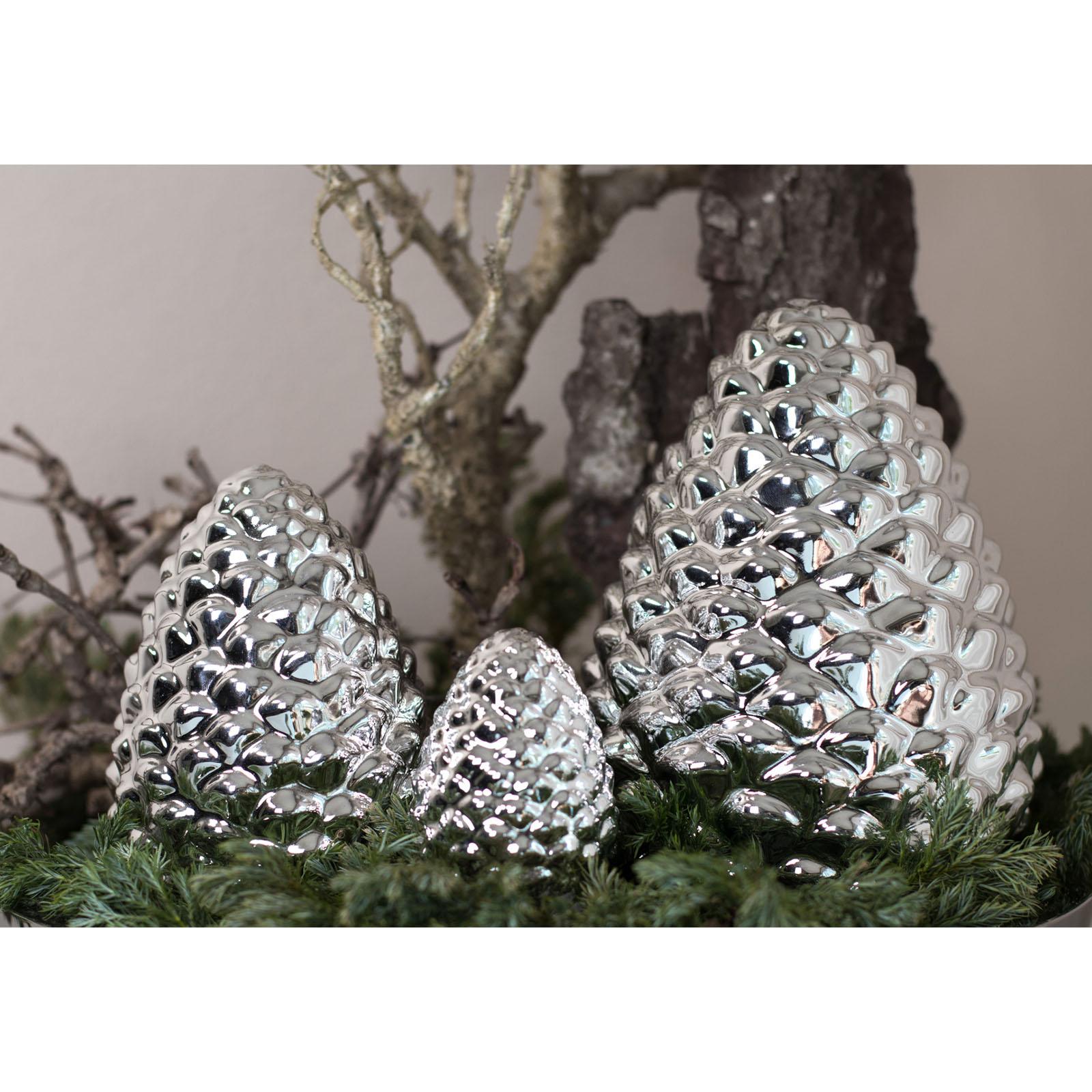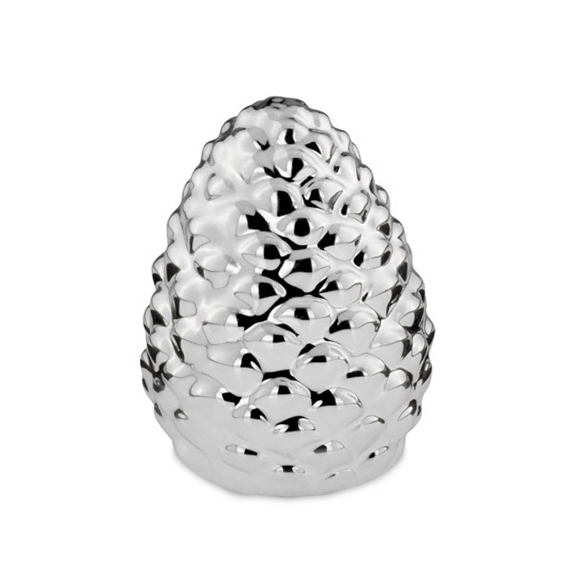 • Höhe ca.: 8.5 cm • Durchmesser ca.: 6.5 cm • Material: Porzellan • Beschichtung: galvanisiert • Oberfläche: glatt poliert, glänzend • spülmaschinengeeignet: nein • Farbe: silber • Eigenschaft: ohne Fuß • Funktionalität: Zum Dekorieren von Tisch und Raum • Platzierungsart: zum Aufstellen • Form: realistisch • Dimension: klein • Motiv: Pinienzapfen • Symbolik: Symbol für Fruchtbarkeit, Schutz & stille Naturkraft • Look & Stil: Detailreich, ausdrucksstark, klar, edel, ruhig, saisonal • Umgebungsnutzung: Für Innenbereich und geschützten Außenbereich • Anlass: Für Herbst, Winter, Advent, Naturdeko, Geschenkidee • Nutzungsbereich: Wohnbereich, Fensterbank, Kommode, Eingangsbereich, Regal • Nutzungsmöglichkeit: Objekt platzieren, Tisch dekorieren, Raum optisch ergänzen • Verbraucherhinweise: nur zur Dekoration geeignet - kein Kinderspielzeug • Gewicht ca.: 0,127 Kg