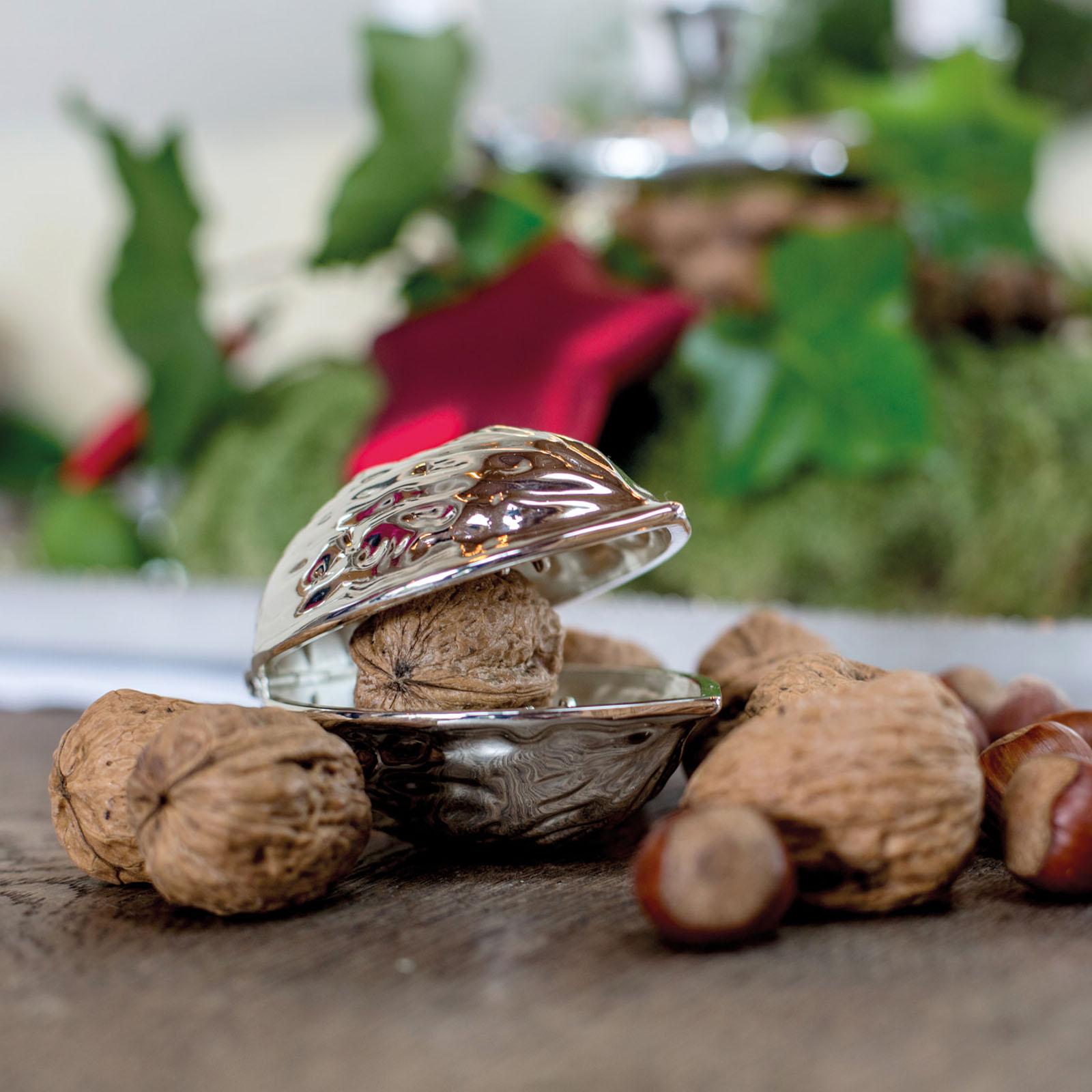 • Länge ca.: 9 cm • Breite ca.: 6.5 cm • Höhe ca.: 5.5 cm • Material: Metall • Beschichtung: versilbert • Veredelung: anlaufgeschützt • Oberfläche: glatt poliert • spülmaschinengeeignet: nein • Farbe: silber • Funktionalität: Zum Aufbrechen von Nussschalen • Platzierungsart: Zum Ablegen auf dem Tisch • Form: rund • Dimension: klein • Motiv: Walnuss • Symbolik: Symbol für Genuss, Natürlichkeit & klassische Winterfreude • Look & Stil: Natürlich geformt, dezent glänzend, kompakt, edel, sinnlich • Umgebungsnutzung: Für Innenbereich und geschützten Außenbereich • Anlass: Für Alltag, Küche, Genussmomente, Winterzeit, Geschenk • Nutzungsbereich: Küche, Esstisch, Wohnbereich, Vorratsraum, Geschenkbox • Nutzungsmöglichkeit: Nüsse knacken, Schale entfernen, trocken reinigen, lagern • Gewicht ca.: 0,24 Kg