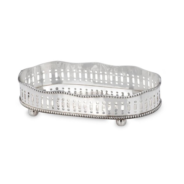 • Länge ca.: 23 cm • Breite ca.: 12 cm • Höhe ca.: 5 cm • Ausführung: hoch • Material: Metall • Beschichtung: schwer versilbert • Veredelung: anlaufgeschützt • Oberfläche: glatt poliert • Oberfläche Details: verziert • spülmaschinengeeignet: nein • Farbe: silber • Eigenschaft: ohne Griffe • Ausstattung: 4 Kugelfüße • Ausstattung 1: hoher gewellter Gitterrand • Ausstattung 2: mittig auf dem Boden ein Ornament • Funktionalität: Zum Präsentieren von Dekoration • Platzierungsart: Auf ebenen Flächen platzierbar • Form: oval • Dimension: klein • Symbolik: Symbol für dekorative Finesse & stilvolles Interior-Flair • Look & Stil: Barockinspiriert, filigran, elegant, wirkungsvoll, charmant • Umgebungsnutzung: Für Innenbereich und geschützten Außenbereich • Anlass: Für Empfang, Präsentation, Wohnen, Dekoration, Flair, Stil • Nutzungsbereich: Sideboard, Kommode, Empfang, Hotel, Vitrine, Wohnzimmer • Nutzungsmöglichkeit: Accessoires zeigen, Flakons platzieren, Deko arrangieren • Gewicht ca.: 0,563 Kg