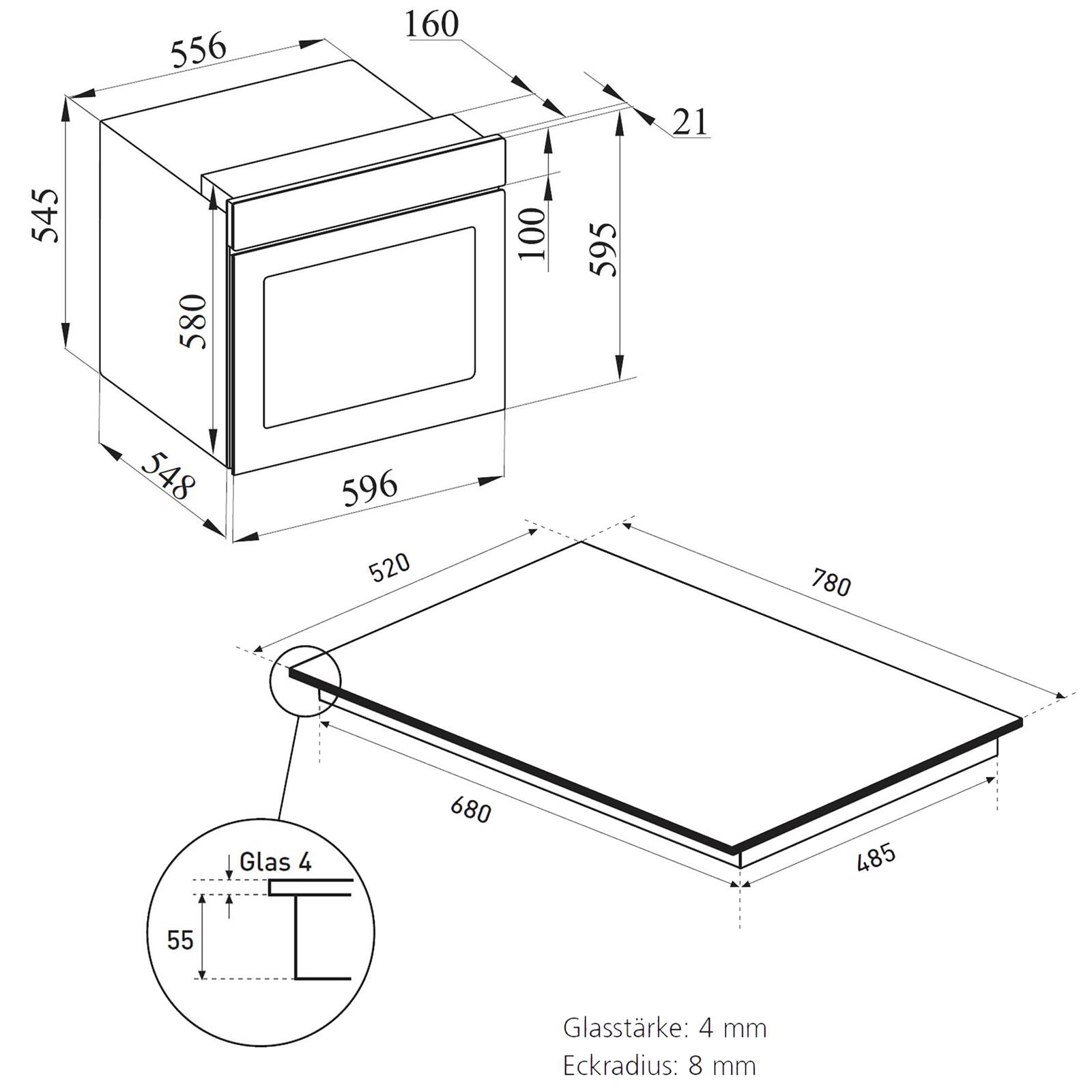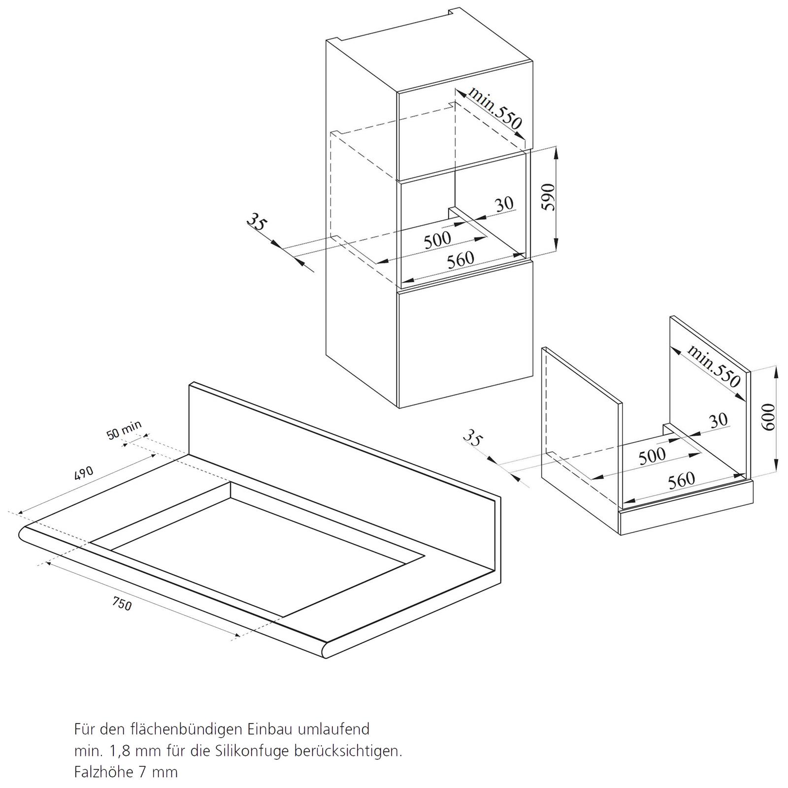 Die erste Ebene des Backofens ist nicht zur Verwendung von Teleskop-Vollauszügen geeignet. Bitte achten Sie darauf, dass das Küchenmöbelmaterial hitzebeständig sein muss. Der schwarze 60 cm Backofen muss zu den Küchenmöbelwänden zentriert und mit den mitgelieferten Schrauben und Buchsen befestigt werden. Die Standfläche in der Nische muss zur Wand hin (ohne Rückwand des Schrankes) eine Aussparung von mindestens 500 x 35 mm aufweisen!