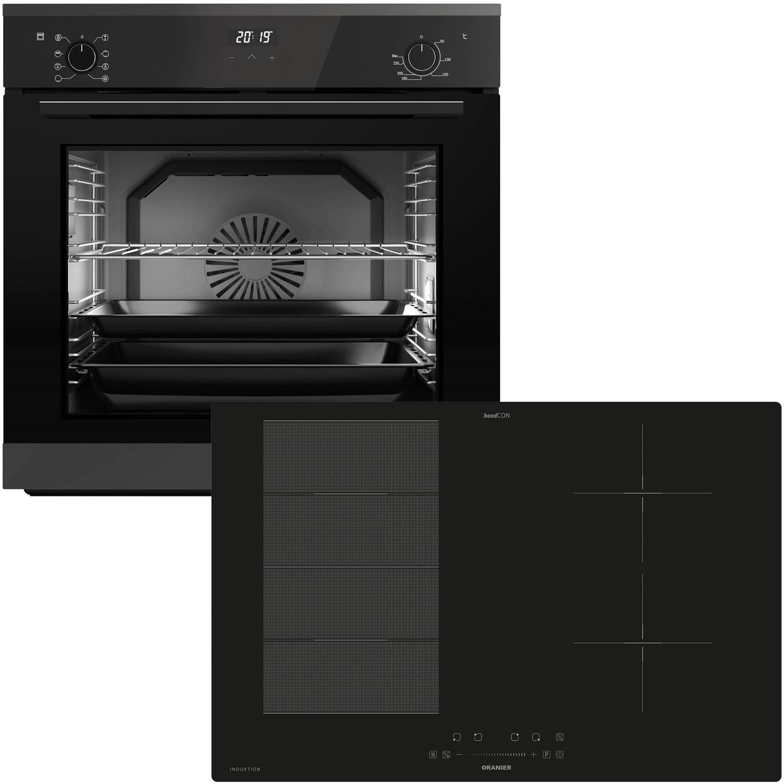 Mit diesem autarken Einbau-Backofen Set im edlen, ansprechenden Design treffen Sie eine ideale Entscheidung, um Ihre Koch- und Backkünste, mit Stil und Technik in Perfektion, in der heimischen Küche auszuleben. Der große XXL Garraum mit einem nutzbaren Volumen von 80 Liter lässt keine Wünsche offen - große Bräter, Auflaufformen oder backofengeeignete Töpfe und Pfannen finden im Backofen-Innenraum Platz. Ein Vorteil dieses Elektro-Backofens ist die autarke Installation, Sie können diesen Backofen optimal in einem Küchen-Hochschrank unabhängig von einem Kochfeld einbauen. Mit den schwarzen, versenkbaren Design Drehknebeln mit weißem fineLINE Ring des funktionellen Backofens haben Sie die Wahl über 9 Funktionen zu entscheiden. Der Einbaubackofen verfügt über Einstellungen wie z.B. echte Heißluft, Oberhitze-Unterhitze mit Umluft, 3D Heißluft, Grill mit Umluft sowie Unterhitze & Auftauen. Dank des großen Backraumes des 60 cm breiten Backofens haben Sie optional die Möglichkeit, den Innenraum mit bis zu 3 Vollauszügen zu erweitern. Dieses große, autarke 80 cm breite FlexX-Induktionskochfeld aus Glaskeramik tritt im eleganten Design in Erscheinung und ermöglicht Ihnen maximale Flexibilität beim Kochen mit viel Platz für induktionsgeeignete Töpfe, Pfannen, einen Bräter oder zum Grillen mit der optional passenden Grillplatte von Oranier. Das 80er Kochfeld mit Induktion hält für Sie für jede Kochweise, angefangen vom Anschwitzen über Dämpfen bis hin zum Garen, verschiedene Einstellungen bereit und ist einfach über die praktische Slider-Steuerung zu bedienen, welche die Stufen zielgenau regelt. Das breite Kochfeld mit großer Induktionsfläche ist mit einer intelligenten Technik ausgestattet, welche es dem Kochfeld erlaubt, dem Kochtopf automatisch die Kochzone zu empfehlen, sobald der Topf erkannt wird. Wichtige Funktionen wie z.B. eine Kindersicherung, ein Überlaufschutz und ein Überhitzungsschutz gibt Ihnen für andere Vorbereitungen und Arbeiten in der Küche einen freien Kopf, so dass Ihnen selbst in stressigen Situationen oder bei Abwesenheit vom Kochfeld nichts anbrennt oder überkocht. Mit unter anderem 3 praktischen Warmhaltestufen ausgestattet, ist dieses 4-Zonen Induktionskochfeld ein zuverlässiges und funktionales Einbaugerät für den täglichen Einsatz in Ihrer Küche.
