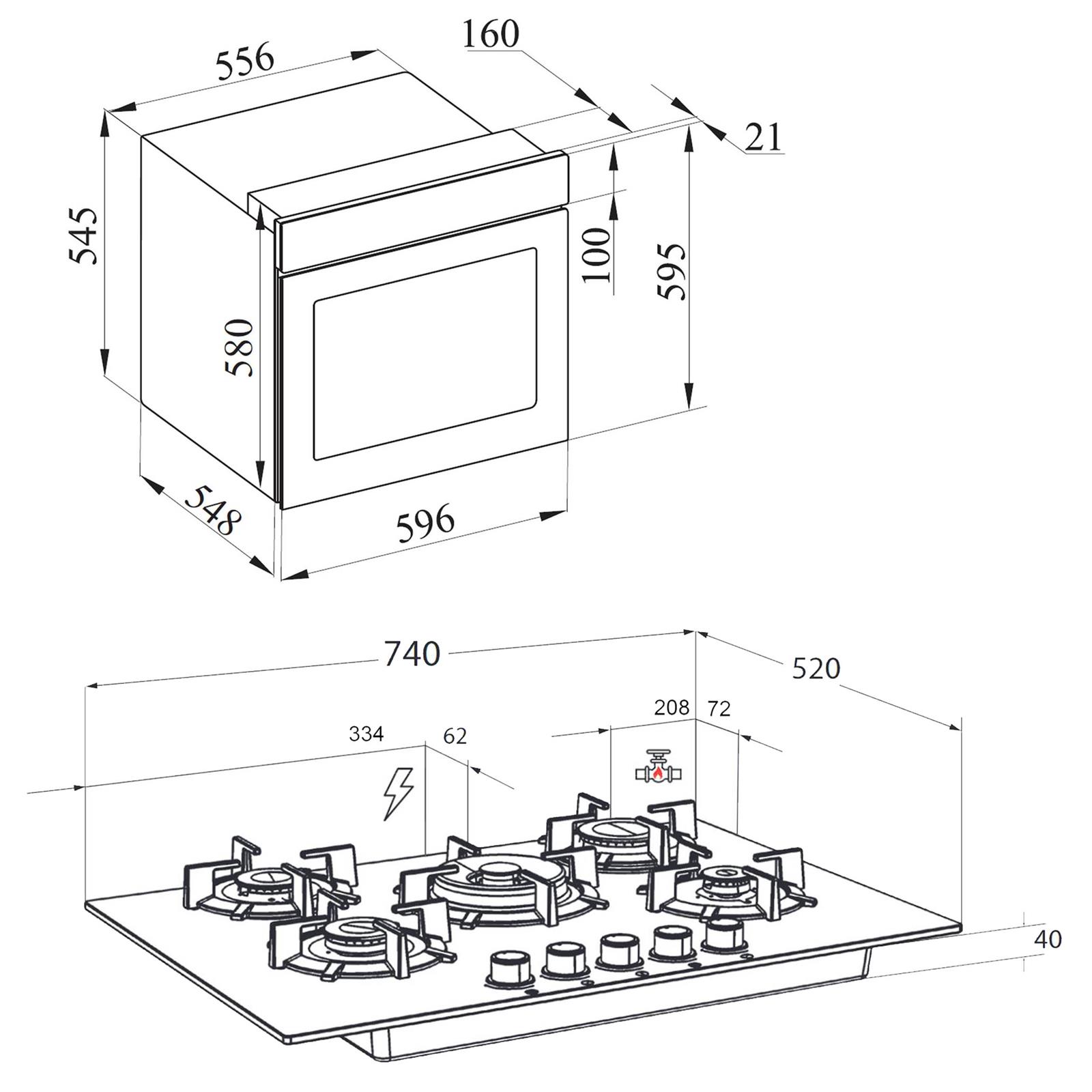 • Gerätebreite: 75 cm • Breite: 740 mm • Höhe: 40 mm • Tiefe: 520 mm • Farbe: schwarz • Material: Glas-Gusseisen • Material Oberfläche: Glaskeramik • Bedienung: Design Bedienknebel • Betrieb: Erdgas: Düsen G20 - 20 mbar • Ausführung: 5-flammig • Installationsart: Einbau • Form: rechteckig • Anschluss: 230 / 50 / - V / Hz / A • Kabel & Anschluss: ca. 140 cm lang, hinten rechts, Gasanschluss 1/2 " • Besonderheit: mit Wok Brenner