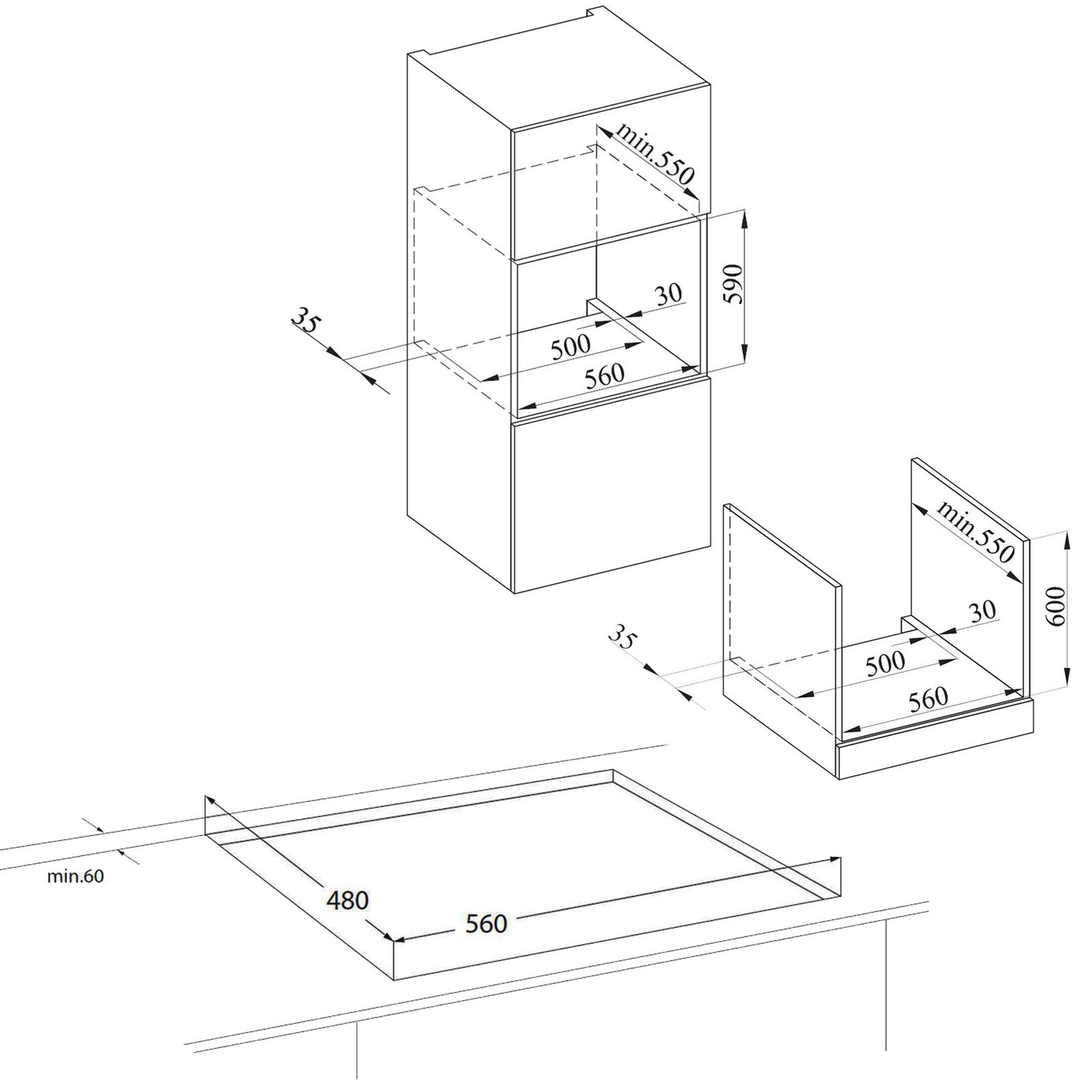 Die erste Ebene des Backofens ist nicht zur Verwendung von Teleskop-Vollauszügen geeignet. Bitte achten Sie darauf, dass das Küchenmöbelmaterial hitzebeständig sein muss. Der schwarze 60 cm Backofen muss zu den Küchenmöbelwänden zentriert und mit den mitgelieferten Schrauben und Buchsen befestigt werden. Die Standfläche in der Nische muss zur Wand hin (ohne Rückwand des Schrankes) eine Aussparung von mindestens 500 x 35 mm aufweisen!