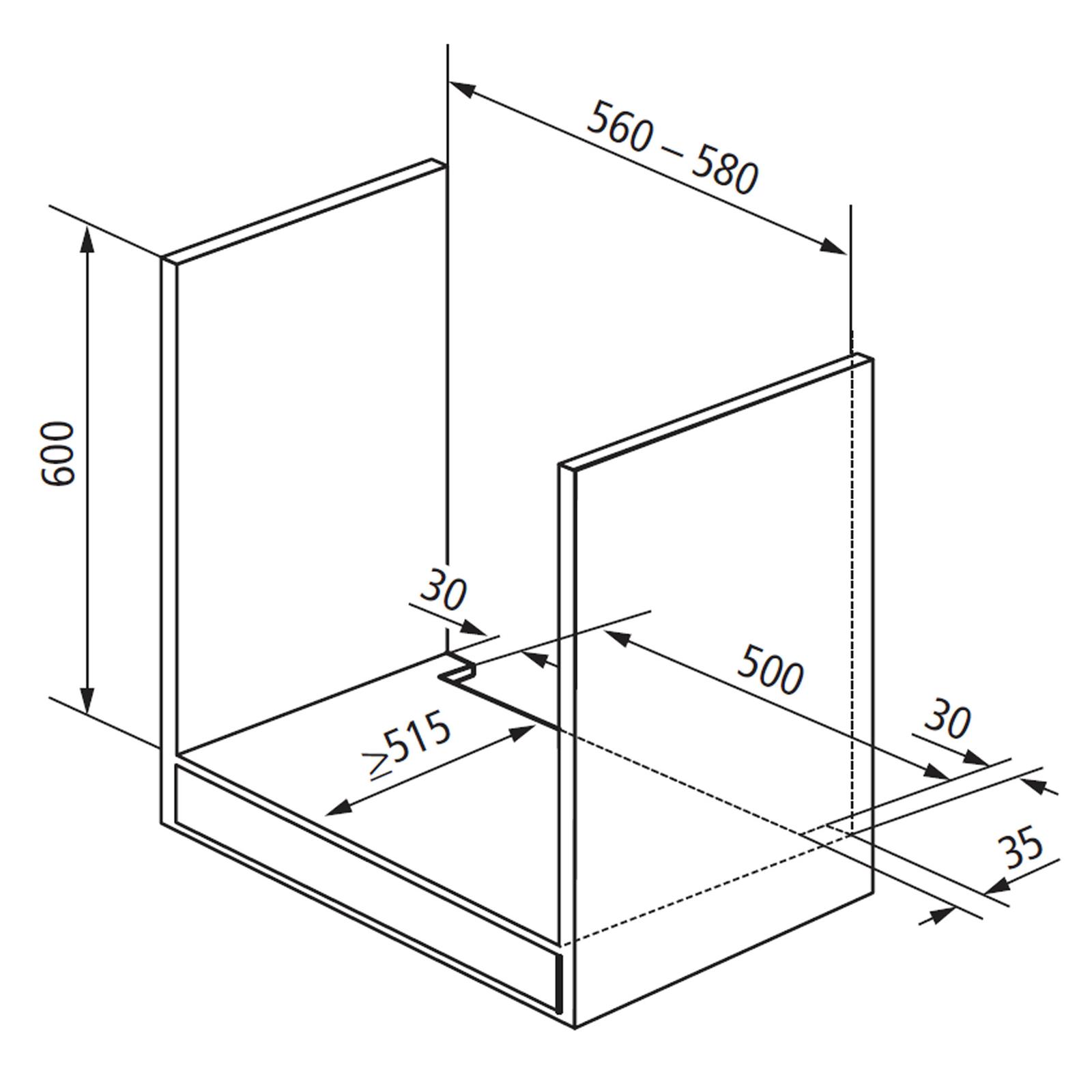 Die Ebene 1 des Backofens ist nicht zur Verwendung von Teleskop-Vollauszügen geeignet. Bitte achten Sie darauf, dass das Küchenmöbelmaterial hitzebeständig sein muss. Der schwarze 60 cm Backofen muss zu den Küchenmöbelwänden zentriert und mit den mitgelieferten Schrauben und Buchsen befestigt werden. Die Standfläche in der Nische muss zur Wand hin (ohne Rückwand des Schrankes) eine Aussparung von mindestens 500 x 35 mm aufweisen!