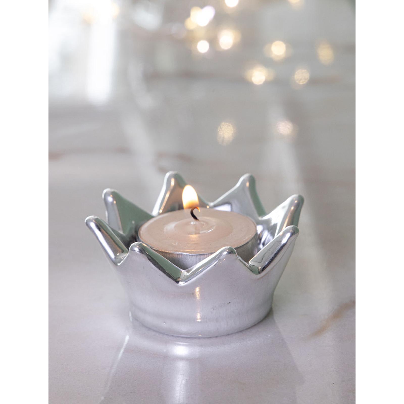 • Länge ca.: 7 cm • Breite ca.: 7 cm • Höhe ca.: 3.3 cm • Kapazität: für 1 Teelicht • Material: Porzellan • Beschichtung: galvanisiert • Oberfläche: glatt poliert, glänzend • spülmaschinengeeignet: nein • Farbe: silber • Funktionalität: Zum Halten von Teelichtern • Platzierungsart: zum Aufstellen • Form: rund • Dimension: klein • Motiv: Krone • Symbolik: Symbol für Würde, Eleganz & königliche Ausstrahlung • Look & Stil: Kompakt, formbetont, royaler Akzent & stilisiert schlicht • Umgebungsnutzung: Für Innenbereich und geschützten Außenbereich • Anlass: Für Entspannung, Gemütlichkeit, Dekoration, Geschenk, Stil • Nutzungsbereich: Tisch, Sideboard, Balkon, Garten, Terrasse, Empfangsbereich • Nutzungsmöglichkeit: Teelicht einsetzen, Licht gestalten, Atmosphäre erzeugen • Besonderheit: Kerze/Teelicht nicht im Lieferumfang enthalten! • Gewicht ca.: 0,064 Kg