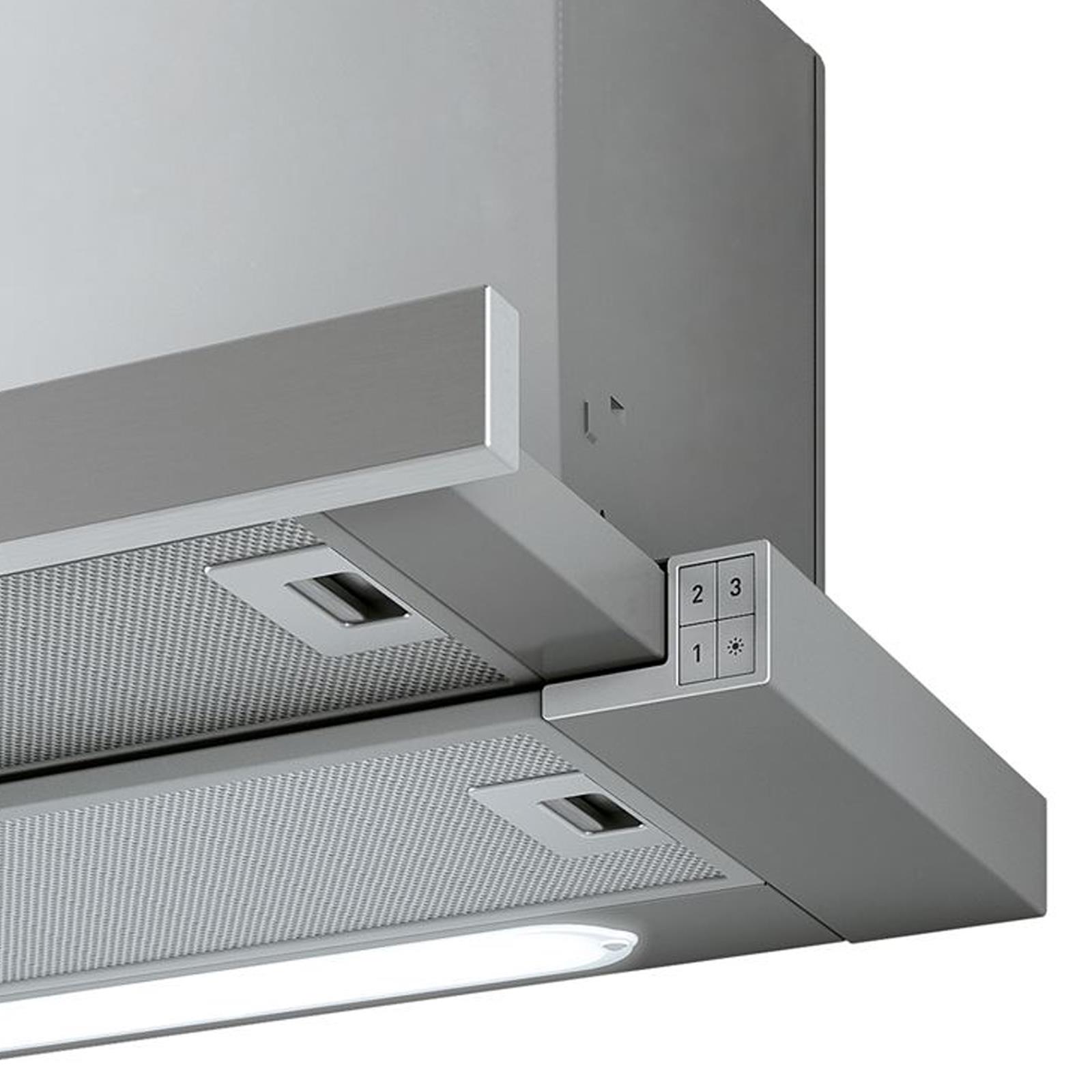 ✓ Die 60 cm breite Einbaudunsthaube für Oberschränke verfügt über eine dreifache Drucktastenbedienung ✓ Die Edelstahl Einbau-Flachschirmhaube ist mit 2 LED Birnen ausgestattet & auf Abluftbetrieb eingestellt ✓ Die LED beleuchtete flache Haube kann auch im Umluftbetrieb genutzt werden & bietet 3 Normalstufen ✓ Der 60 cm Einbau - Schublüfter mit Frontblende besitzt innen 2 spülmaschinengeeignete Metallfettfilter ✓ Platzsparende ausziehbare Edelstahl Abluft Dunsthaube zum Einbauen in beliebige Küchenoberschränke