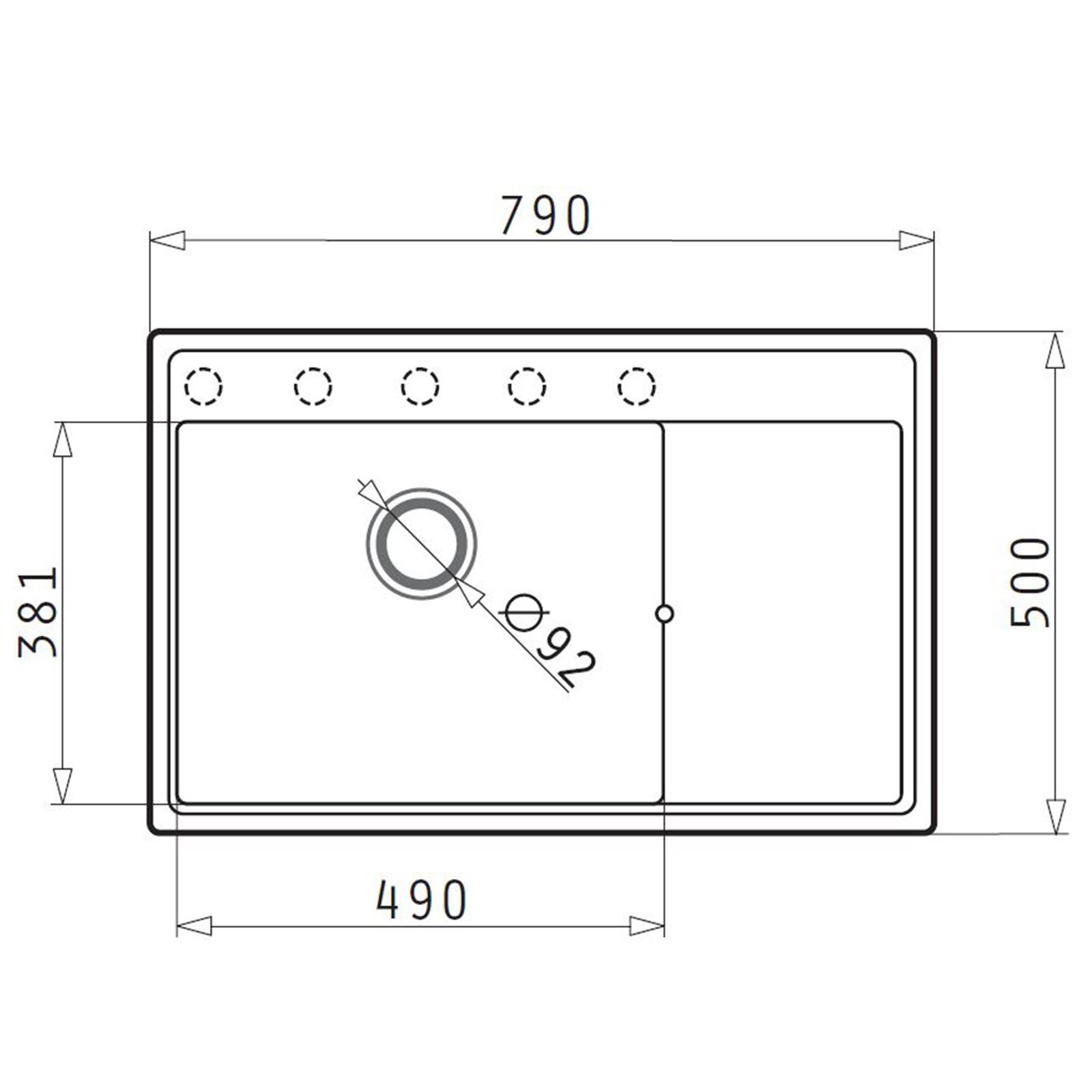 ☛ Ausstattung 1 Becken mit Abtropffläche 5 Hahnlöcher nur vorgebohrt mit Überlauf im Becken rundes Dreh-Excenter-Ventil 92 mm Einbau: Becken links kurzfristige Temperaturbeständigkeit 200°C hygienische Oberfläche durch Silberionen ☛ Abmessungen für Unterschrankbreite ab 60 cm Spülbecken 490 x 381 x 190 mm Abtropffläche 300 x 381 mm