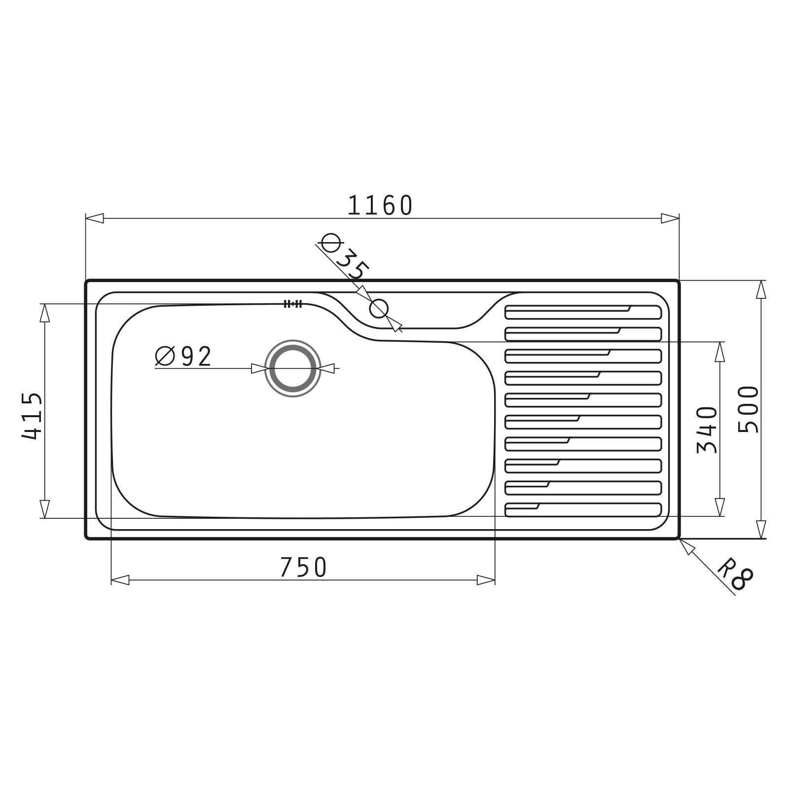 ☛ Ausstattung 1 Becken mit Abtropffläche 1 Hahnloch mit Überlauf im Becken rundes Siebkorb-Ventil 92 mm Einbau: Becken links aufgeschäumte Dichtung (EasyFix) ☛ Abmessungen für Unterschrankbreite ab 90 cm Spülbecken 750 x 415 x 210 mm Abtropffläche 410 x 415 mm Ausschnittmaß: 1140 x 480 mm