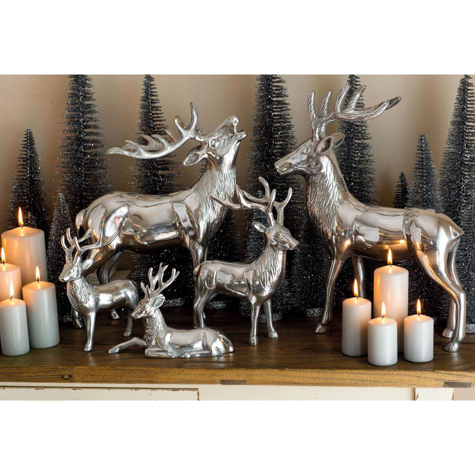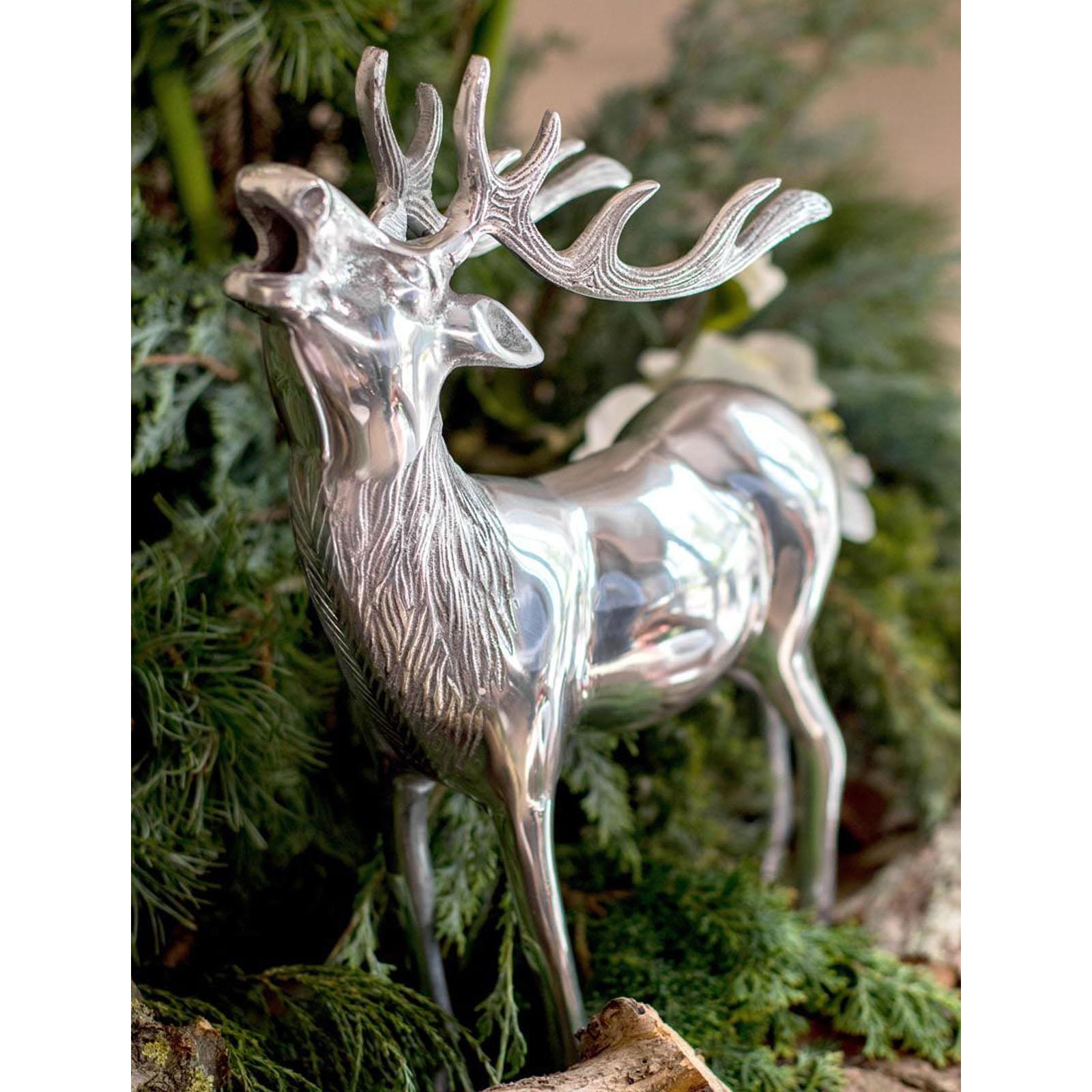 Erleben Sie majestätische Eleganz in Ihrer Dekoration mit dieser beeindruckenden Hirsch-Dekofigur aus hochwertigem Aluminium. Der stolz aufrecht stehende Hirsch, mit erhobenem Kopf und geöffnetem Maul, scheint seinen Ruf in die Winterlandschaft hinauszuschicken. Die glatt polierte, silberne Oberfläche verleiht ihm einen luxuriösen Glanz und macht ihn zu einem extravaganten Blickfang in Ihrer Winter- oder Festtagsdeko. Dieser glänzende Deko-Hirsch überzeugt durch seine hochwertige Verarbeitung und die detailgetreue Darstellung. Die beeindruckende Höhe von 42 cm macht ihn zu einem herausragenden Dekorationselement, das sowohl auf dem Kaminsims, im Eingangsbereich als auch als Highlight auf dem Sideboard perfekt zur Geltung kommt. Sein zeitloses Design fügt sich nahtlos in verschiedene Einrichtungsstile ein und verleiht Ihrem Zuhause eine edle und zugleich natürliche Atmosphäre. Das röhrende Hirsch-Motiv symbolisiert Stärke, Freiheit und die Schönheit der Wildnis. Die präzise Gestaltung und das polierte Finish dieser Aluminium-Dekofigur sorgen für eine besondere Eleganz, die Ihrer Festtagsdeko einen exklusiven Charakter verleiht. Bereichern Sie Ihr Ambiente mit dieser majestätischen Hirschfigur, die durch ihre langlebige Verarbeitung und ihr ausdrucksstarkes Design Jahr für Jahr ein beeindruckendes Highlight Ihrer saisonalen Dekoration sein wird.