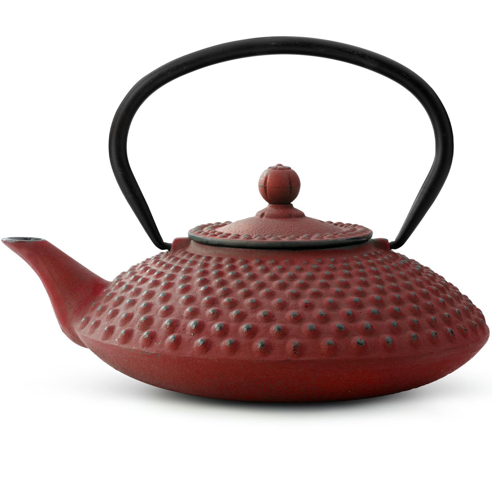 Produkt-Eigenschaften ✓ Roter genoppter Asia Teekessel 1.25 L aus robustem Gusseisen mit hervorragender Wärmespeicherung