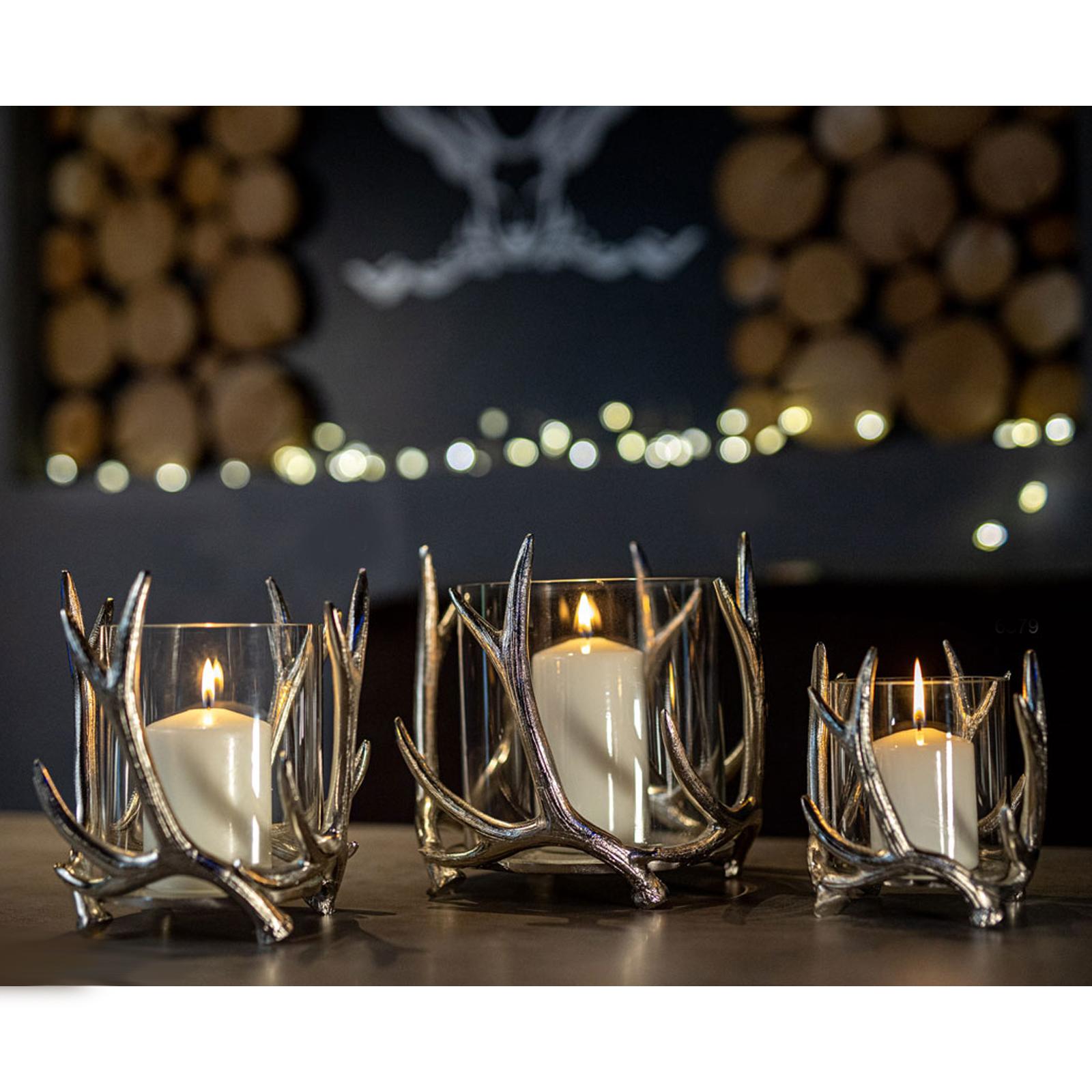 • Höhe ca.: 20 cm • Durchmesser ca.: 19 cm • Kapazität: für 1 Teelicht oder Stumpenkerze • Material: Aluminium • Oberfläche: poliert • spülmaschinengeeignet: nein • Farbe: silber • Eigenschaft: Glaszylinder oben & unten offen & abnehmbar • Funktionalität: Zum Dekorieren und Beleuchten mit Kerzen • Platzierungsart: zum Aufstellen • Form: abstrakt • Dimension: mittel • Motiv: Geweih • Motiv-Design: Glaseinfassung in Geweihform • Symbolik: Symbol für winterliche Eleganz und festliche Atmosphäre • Look & Stil: Rustikales Design mit modernem Finish • Umgebungsnutzung: Nur für Innenbereich • Anlass: Für Wohndeko, Tischdeko, Präsent, Licht, Geschenk, Stil • Nutzungsbereich: Esstisch, Fensterbank, Sideboard, Empfang, Wohnzimmer, Regal • Nutzungsmöglichkeit: Kerze geschützt einsetzen, Licht betonen, Stimmung erzeugen • Gewicht ca.: 1,9 Kg