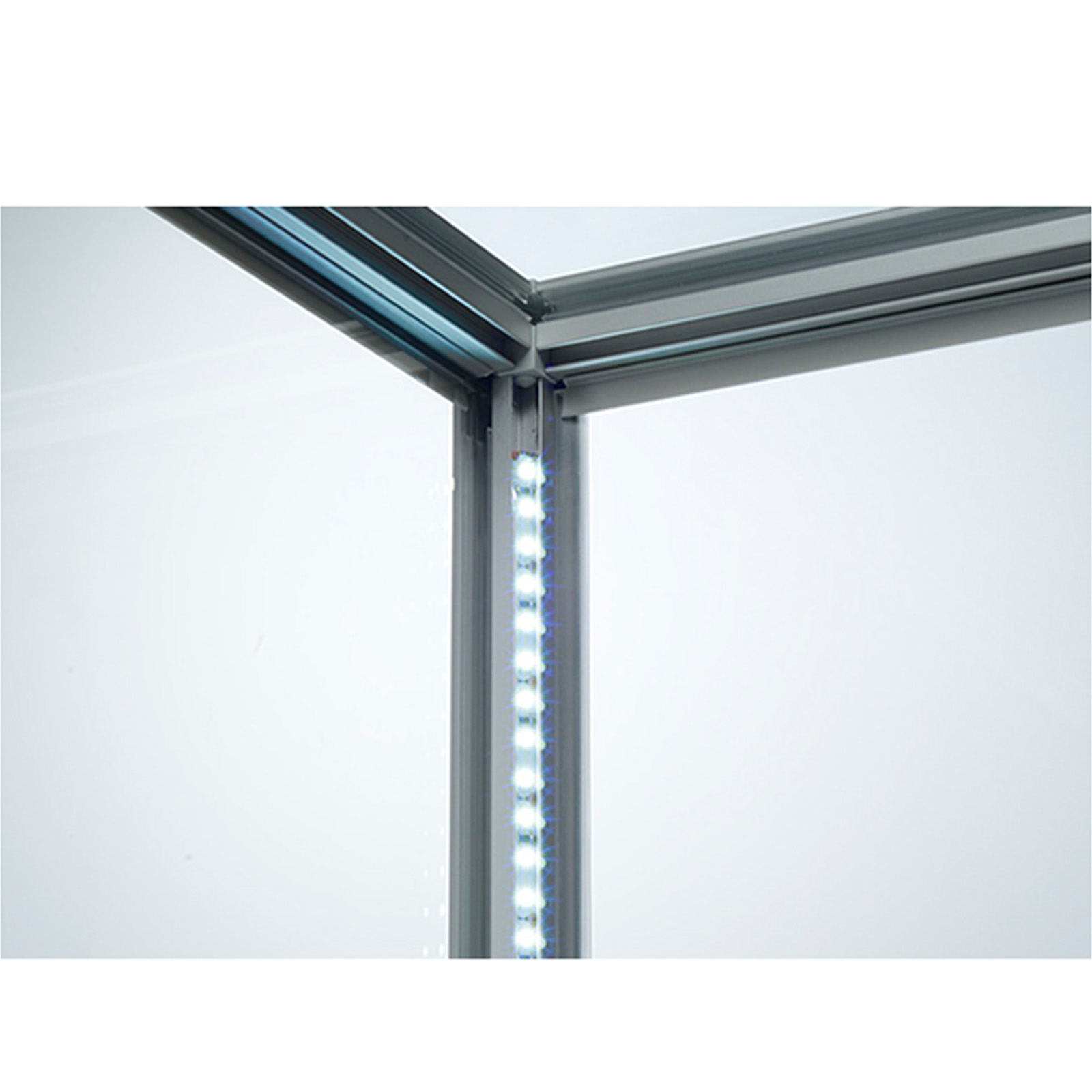 ☛ Ausstattung beidseitig zu öffnen 4 kugelgelagerte Rollen Ø 50 mm - Gesamthöhe: 6,5 cm ☛ Sicherheit je 1 Schwenktür/Drehtür Vorder-/Rückseite Türanschlag rechts 1 Schwenktür mit Schloss (2 Schlüssel) Schloss-Position oben links ☛ Beleuchtung mit LED-Streifenbeleuchtung LED senkrecht in allen 4 senkrechten Profilen integriert SMD-LED Anzahl der Brennstellen 120 pro m Lichtfarbe neutralweiß Farbtemperatur 4000-4500 Kelvin ca. 2400 Lumen Leistung 9,6 W pro m ca. 2 m Anschlusskabel mit Druckschalter ☛ Besonderheiten Lamellen-Mittelwand FlexiSlot Kunststoff-Lamellenwand-Element beidseitig bestückbar