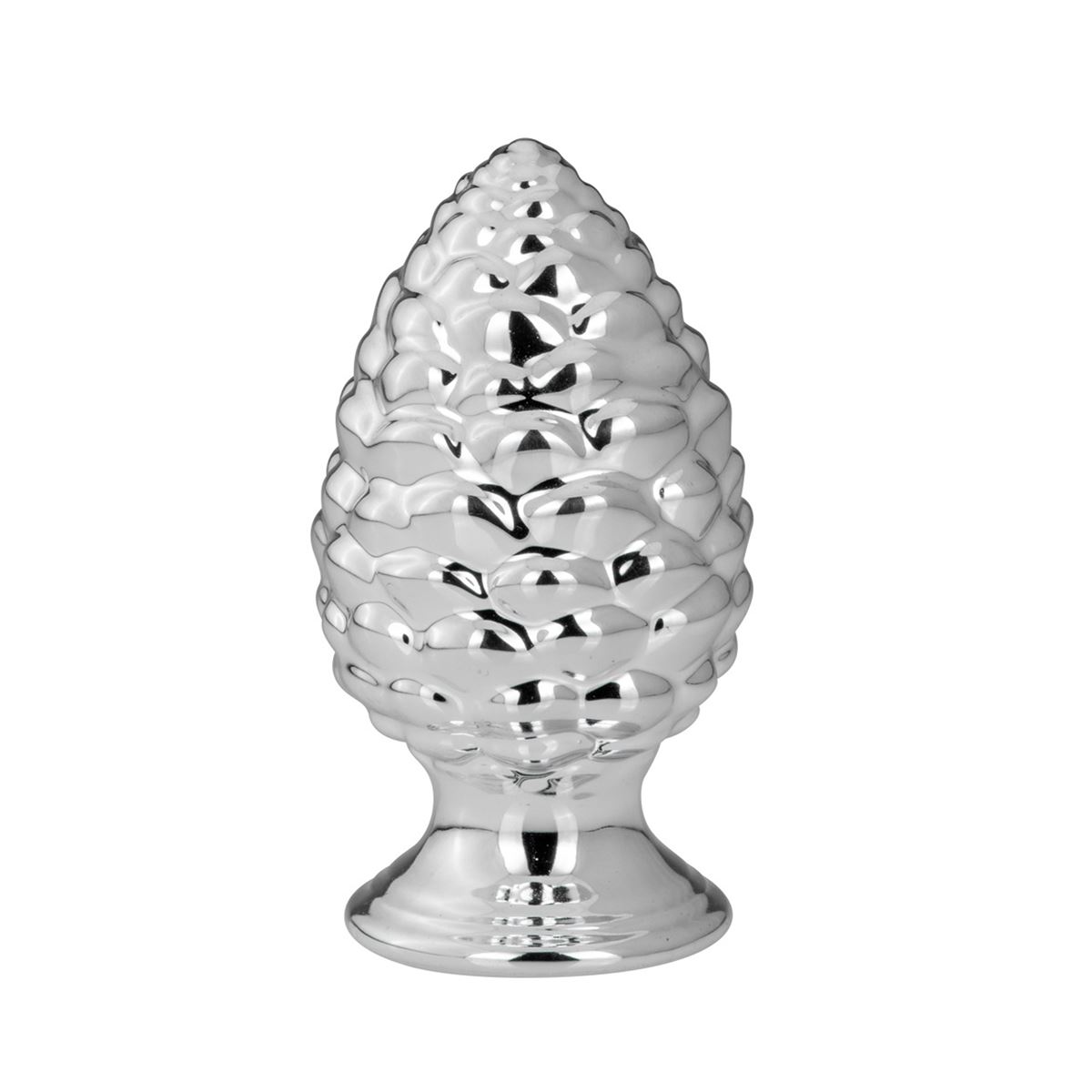 • Länge ca.: 7 cm • Breite ca.: 7 cm • Höhe ca.: 14 cm • Material: Porzellan • Beschichtung: galvanisiert • Oberfläche: glatt poliert, glänzend • spülmaschinengeeignet: nein • Farbe: silber • Ausstattung: runder Standfuß • Funktionalität: Zum Dekorieren von Tisch und Raum • Platzierungsart: zum Aufstellen • Form: realistisch • Dimension: mittelgroß • Motiv: Pinienzapfen • Symbolik: Symbol für Schutz, Fruchtbarkeit & naturbezogene Eleganz • Look & Stil: Detailreich, saisonal inspiriert, edel, modern, wirkungsvoll • Umgebungsnutzung: Für Innenbereich und geschützten Außenbereich • Anlass: Für Herbst, Winter, Advent, Naturdeko, Geschenkidee • Nutzungsbereich: Wohnbereich, Fensterbank, Kommode, Eingangsbereich, Regal • Nutzungsmöglichkeit: Objekt platzieren, Tisch dekorieren, Raum optisch ergänzen • Verbraucherhinweise: nur zur Dekoration geeignet - kein Kinderspielzeug • Gewicht ca.: 0,218 Kg