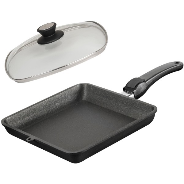 Die flache, viereckige Bratpfanne aus beschichtetem Aluminiumguss für alle Kochfeldarten, ohne Induktion, gewährt Ihnen für eine vielseitige Zubereitung zum Braten eine vorteilhafte Alugusspfanne mit einem ergonomischen, abnehmbaren Griff. Mit der kleinen Universal-Pfanne aus Aluguss können Sie Ihrer Kreativität freien Lauf lassen und zaubern im Handumdrehen deftige Barbecue-Beilagen wie Steaks, Bratwürstchen, Gemüse und Fleisch für ein leckeres fettarmes BBQ.