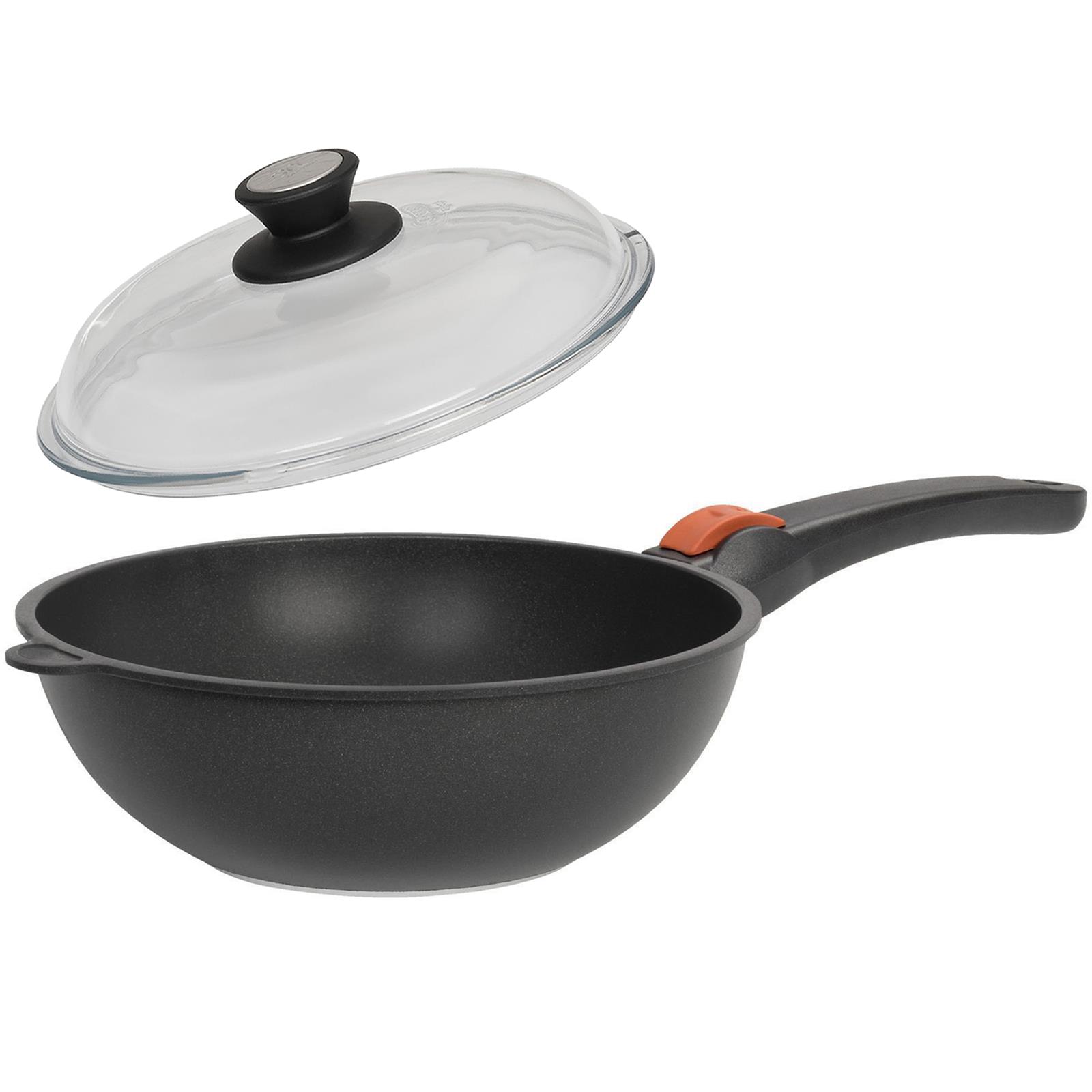 Produkt-Eigenschaften des runden Aluguss-Woks mit Induktion✓ Große Antihaft Wok-Pfanne 28 cm aus stabilen & robusten Alu-Handguss mit hohem Rand & Glasdeckel