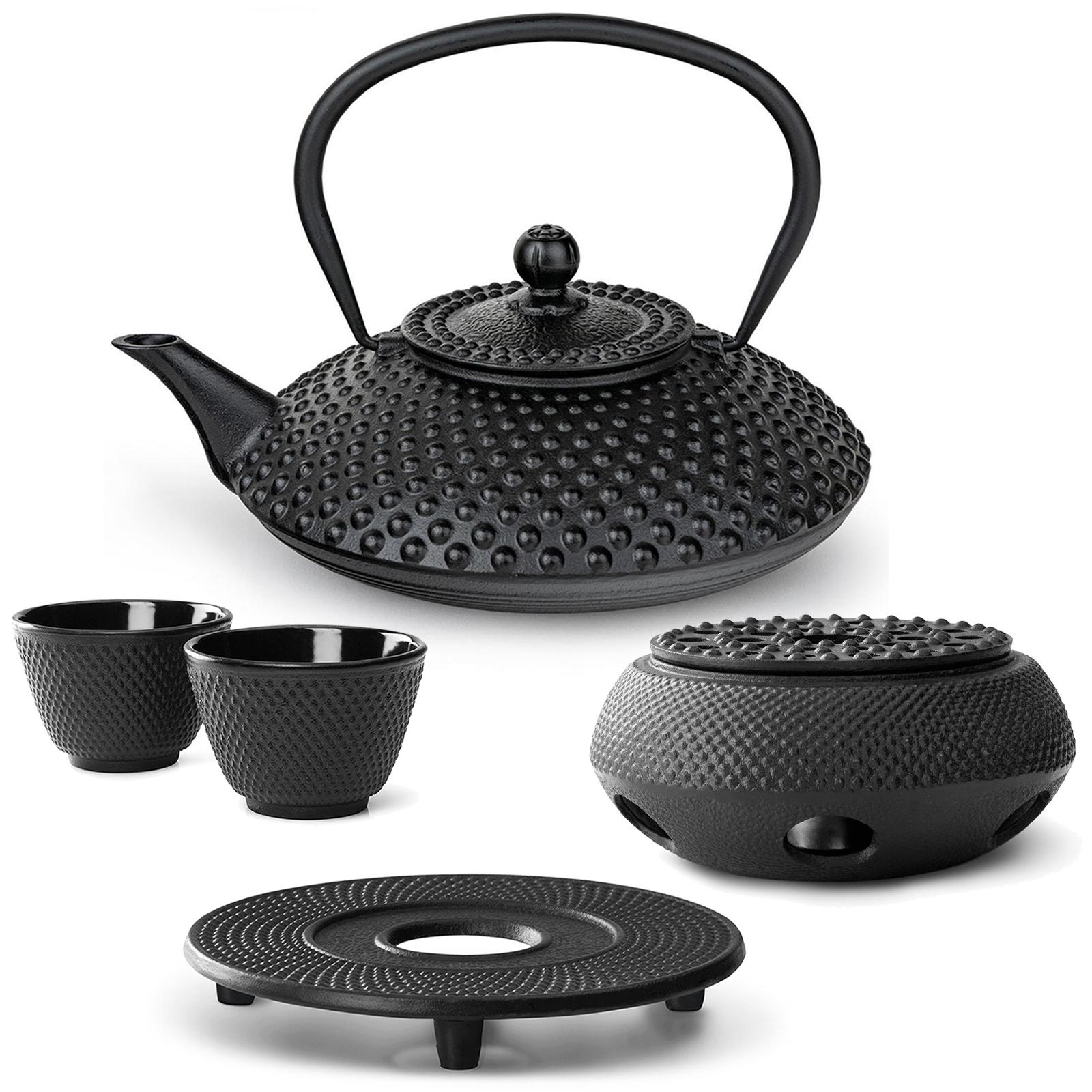 5-teiliges Teekannen-Set aus Gusseisen in flacher Formgebung und im Asien-Stil - Tradition im zeitlosen, eleganten Schwarz! Entdecken Sie den Charme fernöstlicher Teezeremonien mit diesem gusseisernen Teekannen-Set im traditionellen asiatischen Design. Das Set umfasst eine flache Gusseisen-Teekanne mit einem Fassungsvermögen von 1.25 Litern, 2 gusseiserne Teebecher, ein passendes Stövchen für ein Teelicht und einen zusätzlichen Untersetzer aus Gusseisen. Dieses Ensemble verbindet zeitloses Design mit herausragender Funktionalität und bietet ein harmonisches Erlebnis für Teeliebhaber. Die massive, induktive Gusseisen-Teekanne hält Ihren Tee besonders lange warm und sorgt für ein genussvolles Trinkerlebnis. Die emaillierte Innenseite verhindert, dass Aromen in das Material eindringen, und bewahrt so den reinen Geschmack Ihrer Teespezialitäten. Die flache, rundliche Form der Gussteekanne sorgt für eine gleichmäßige Verteilung der Aromen. Dadurch kann sich der Geschmack Ihres Tees optimal entfalten, was jeden Schluck zu einem besonderen Genuss macht. Ein herausnehmbarer Teefilter aus hochwertigem Edelstahl ermöglicht die einfache Zubereitung loser Teesorten. Egal, ob Sie feine Kräutermischungen, grünen Tee oder kräftigen Schwarztee bevorzugen - dieser Filter macht die Zubereitung unkompliziert und einfach. Die induktionsfähige Teekanne im tiefen Schwarz ist nicht nur ein optisches Highlight, sondern auch äußerst vielseitig einsetzbar. Sie ist für alle Herdarten geeignet, einschließlich Induktions- und Gaskochfeldern. Das macht die 1250 ml Gusskanne zu einem flexiblen Begleiter in jeder Küche. Die 2 gusseisernen Teebecher, die in diesem Set enthalten sind, runden das Erlebnis ab. Mit ihrer robusten Verarbeitung und der asiatischen Optik passen sie perfekt zur Teekanne. Die genoppte Oberfläche sorgt nicht nur für ein stilvolles Design, sondern auch für eine angenehme Haptik beim Genuss Ihres Tees. Das im Set enthaltene Stövchen aus Gusseisen macht dieses Teekannen-Set zu einem besonderen Highlight. Es wurde speziell für ein Teelicht gestaltet, das Ihren Tee über längere Zeit warmhält und dabei eine stimmungsvolle Atmosphäre schafft. Mit seinem traditionellen asiatischen Design und der hochwertigen Verarbeitung ist es nicht nur funktional, sondern auch ein dekoratives Element auf jedem Tisch. Zusätzlich sorgt der mitgelieferte Untersetzer aus Gusseisen für noch mehr Flexibilität. Er schützt Ihre Tischoberfläche stilvoll vor Hitze und ergänzt das Set mit einem weiteren praktischen und ästhetischen Detail. Mit der richtigen Pflege bleibt dieses hochwertige Gusseisen-Set über viele Jahre hinweg ein zuverlässiger und ästhetischer Begleiter. Es eignet sich hervorragend für Ihre persönliche Teezeremonie und bietet sich ebenso als edles Geschenk an. Diese flache Teekanne aus Gusseisen kombiniert traditionelles asiatisches Design mit moderner Funktionalität und ist die perfekte Wahl für alle, die Wert auf Qualität, Langlebigkeit und Stil legen. Lassen Sie sich von diesem Gusseisen Tee-Set inspirieren und genießen Sie Tee auf die kunstvollste Weise!