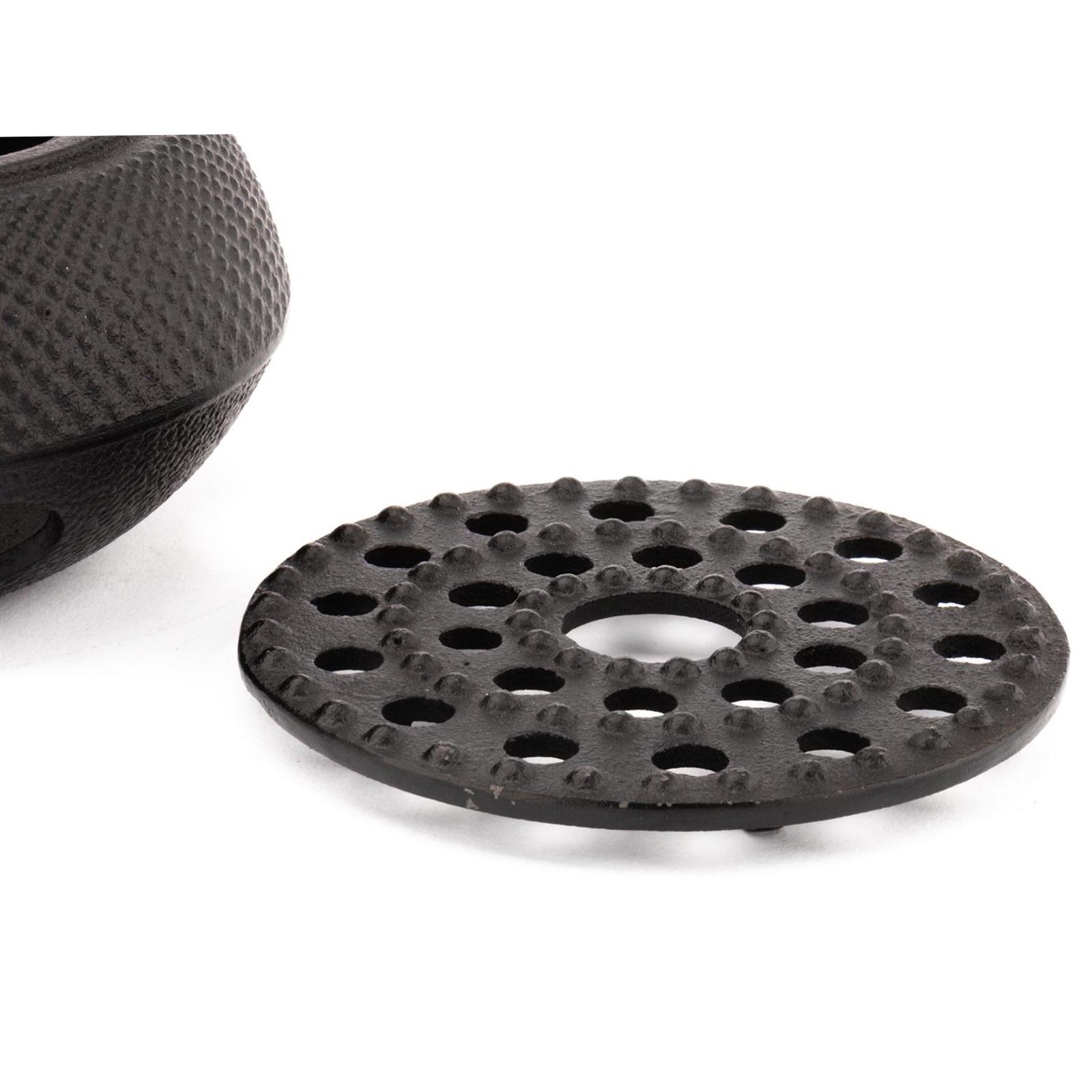 • Höhe: 6.3 cm • Durchmesser: 14.4 cm • Material: Gusseisen • Innen-Material: emailliert • Oberfläche: genoppt • Farbe: schwarz • Finish: matt • Form: rund • Ausführung: hoch • Produktdimension: klein • Besonderheit: für 1 Teelicht • Eigenschaft: Ø Stellfläche oben: 10.3 cm • Design: asiatisch • Stil: traditionell • Anlass: gedeckter Tisch, Kaffee- und Teetafel • Serie: Asia Jang • Modell: G005Z • Gewicht ca.: 1,15 Kg