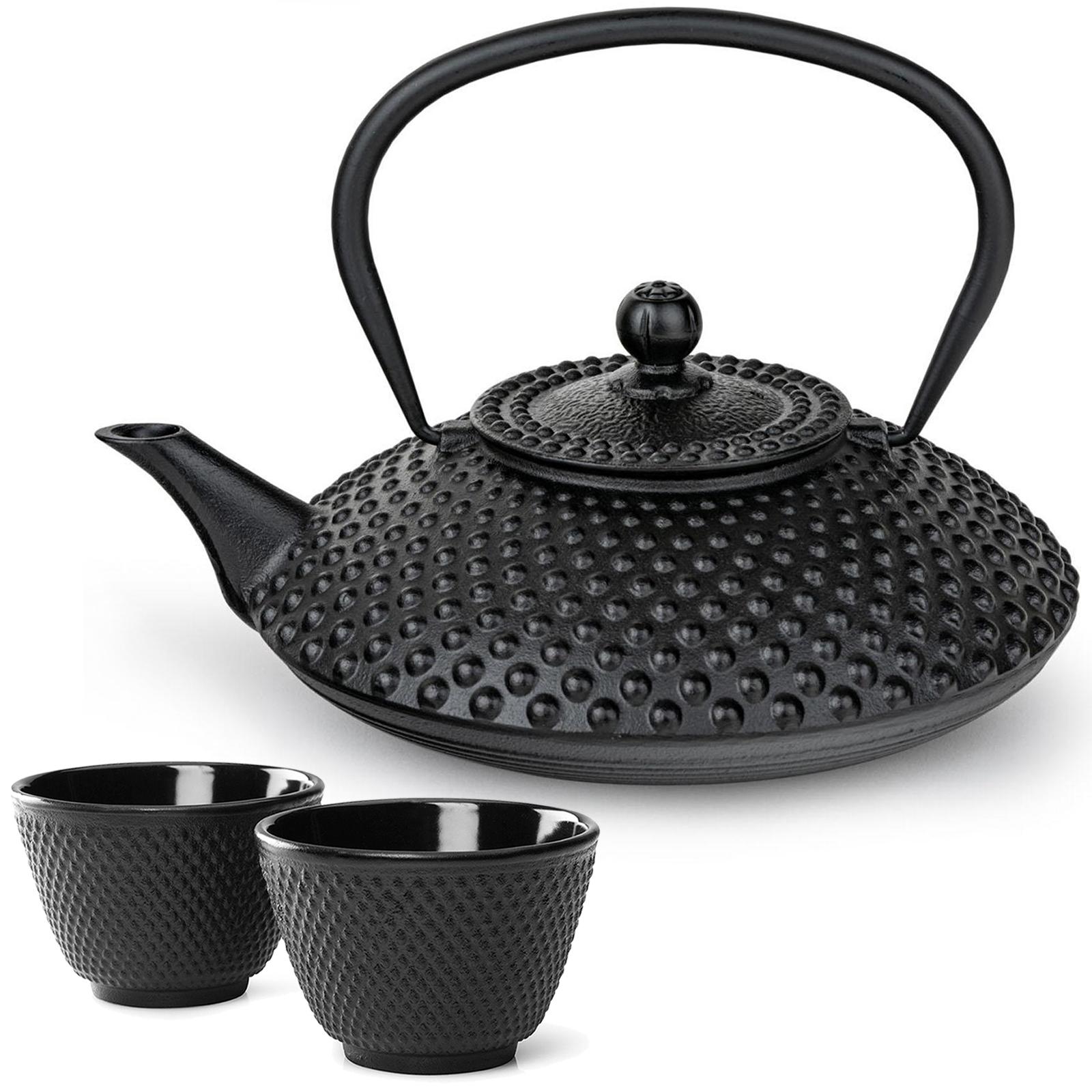 3-teiliges Teekannen-Set aus Gusseisen in flacher Formgebung und im Asien-Stil - Tradition im zeitlosen, eleganten Schwarz! Entdecken Sie den Charme fernöstlicher Teezeremonien mit diesem gusseisernen Teekannen-Set im traditionellen asiatischen Design. Das Set umfasst eine flache Gusseisen-Teekanne mit einem Fassungsvermögen von 1.25 Litern sowie 2 gusseiserne Teebecher, die perfekt aufeinander abgestimmt sind. Dieses Ensemble verbindet zeitloses Design mit herausragender Funktionalität und bietet ein harmonisches Erlebnis für Teeliebhaber. Die massive, induktive Guss-Teekanne hält Ihren Tee besonders lange warm und sorgt für ein genussvolles Trinkerlebnis. Die emaillierte Innenseite verhindert, dass Aromen in das Material eindringen, und bewahrt so den reinen Geschmack Ihrer Teespezialitäten. Die flache, rundliche Form der Gussteekanne sorgt für eine gleichmäßige Verteilung der Aromen. Dadurch kann sich der Geschmack Ihres Tees optimal entfalten, was jeden Schluck zu einem besonderen Genuss macht. Ein herausnehmbarer Teefilter aus hochwertigem Edelstahl ermöglicht die einfache Zubereitung loser Teesorten. Egal, ob Sie feine Kräutermischungen, grünen Tee oder kräftigen Schwarztee bevorzugen - dieser Filter macht die Zubereitung unkompliziert und einfach. Die induktionsfähige Teekanne im tiefen Schwarz ist nicht nur ein optisches Highlight, sondern auch äußerst vielseitig einsetzbar. Sie ist für alle Herdarten geeignet, einschließlich Induktions- und Gaskochfeldern. Das macht die 1250 ml Gusskanne zu einem flexiblen Begleiter in jeder Küche. Die 2 genoppten Teebecher, die in diesem Set enthalten sind, runden das Erlebnis ab. Mit ihrer robusten Verarbeitung und der asiatischen Optik passen sie perfekt zur Teekanne. Die genoppte Oberfläche sorgt nicht nur für ein stilvolles Design, sondern auch für eine angenehme Haptik beim Genuss Ihres Tees. Mit der richtigen Pflege bleibt dieses hochwertige Gusseisen-Set über viele Jahre hinweg ein zuverlässiger und ästhetischer Begleiter. Es eignet sich hervorragend für Ihre persönliche Teezeremonie und bietet sich ebenso als edles Geschenk an. Diese flache Teekanne aus Gusseisen kombiniert traditionelles asiatisches Design mit moderner Funktionalität und ist die perfekte Wahl für alle, die Wert auf Qualität, Langlebigkeit und Stil legen. Lassen Sie sich von diesem Gusseisen Tee-Set inspirieren und genießen Sie Tee auf die kunstvollste Weise!