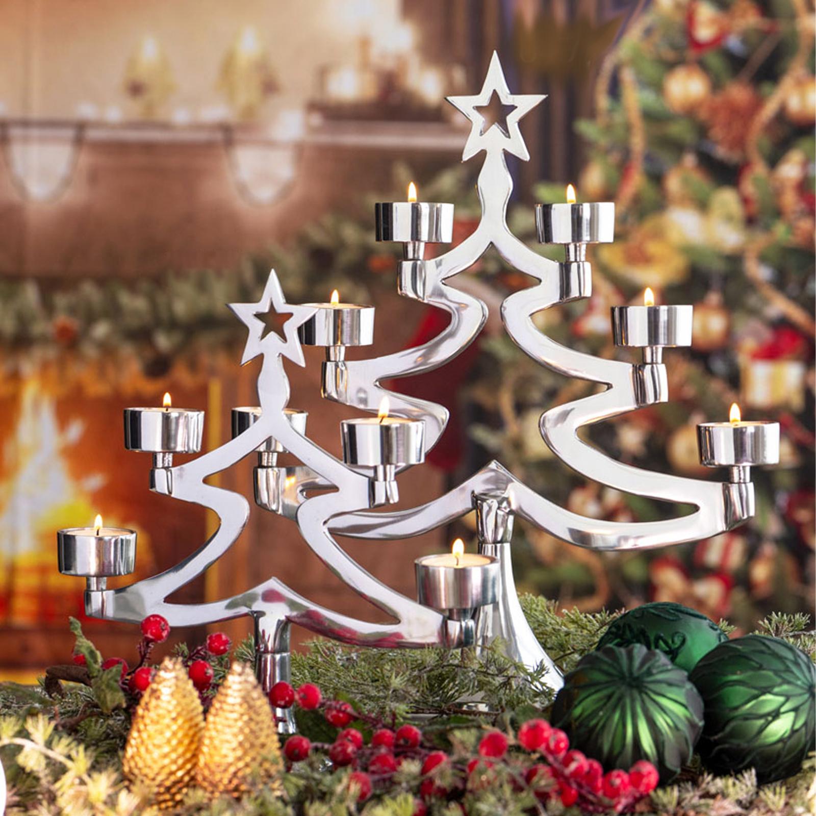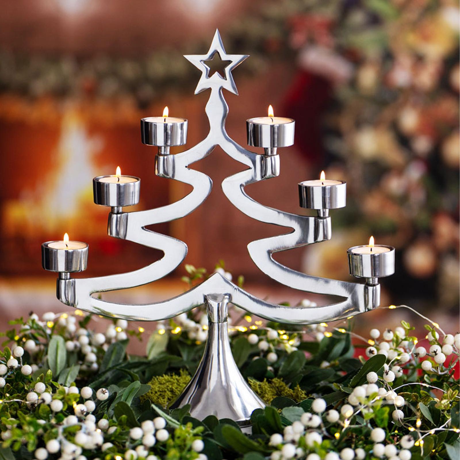 • Länge ca.: 35.0 cm • Breite ca.: 10.5 cm • Höhe ca.: 39.0 cm • Kapazität: für 6 Teelichter • Material: Aluminium • Oberfläche: glatt poliert • Oberfläche Details: glänzend • spülmaschinengeeignet: nein • Farbe: silber • Ausstattung: hoher Standfuß • Funktionalität: Zum Halten von Teelichtern • Platzierungsart: Zum Aufstellen • Form: baumförmig • Dimension: groß • Motiv: Tannenbaum • Motiv-Design: 6 Kerzenhalter an den Tannenspitzen • Symbolik: Symbol für Weihnachten, Licht und Geborgenheit • Look & Stil: Zeitlose Eleganz trifft auf festliche Wärme • Umgebungsnutzung: Nur für Innenbereich • Anlass: Für Entspannung, Gemütlichkeit, Dekoration, Geschenk, Stil • Nutzungsbereich: Tisch, Sideboard, Balkon, Garten, Terrasse, Empfangsbereich • Nutzungsmöglichkeit: Teelicht einsetzen, Licht gestalten, Atmosphäre erzeugen • Besonderheit: Kerze/Teelicht nicht im Lieferumfang enthalten! • Gewicht ca.: 1 Kg