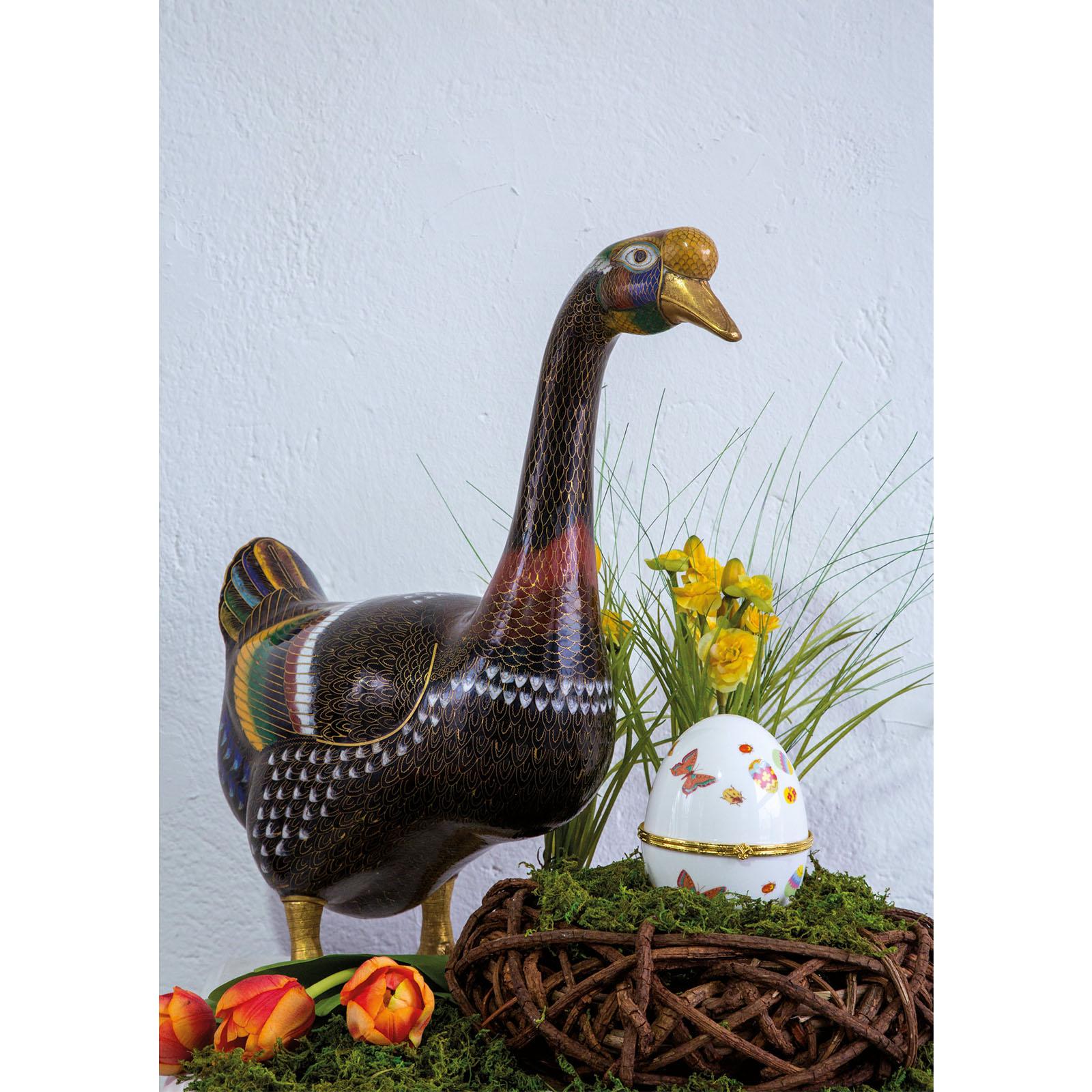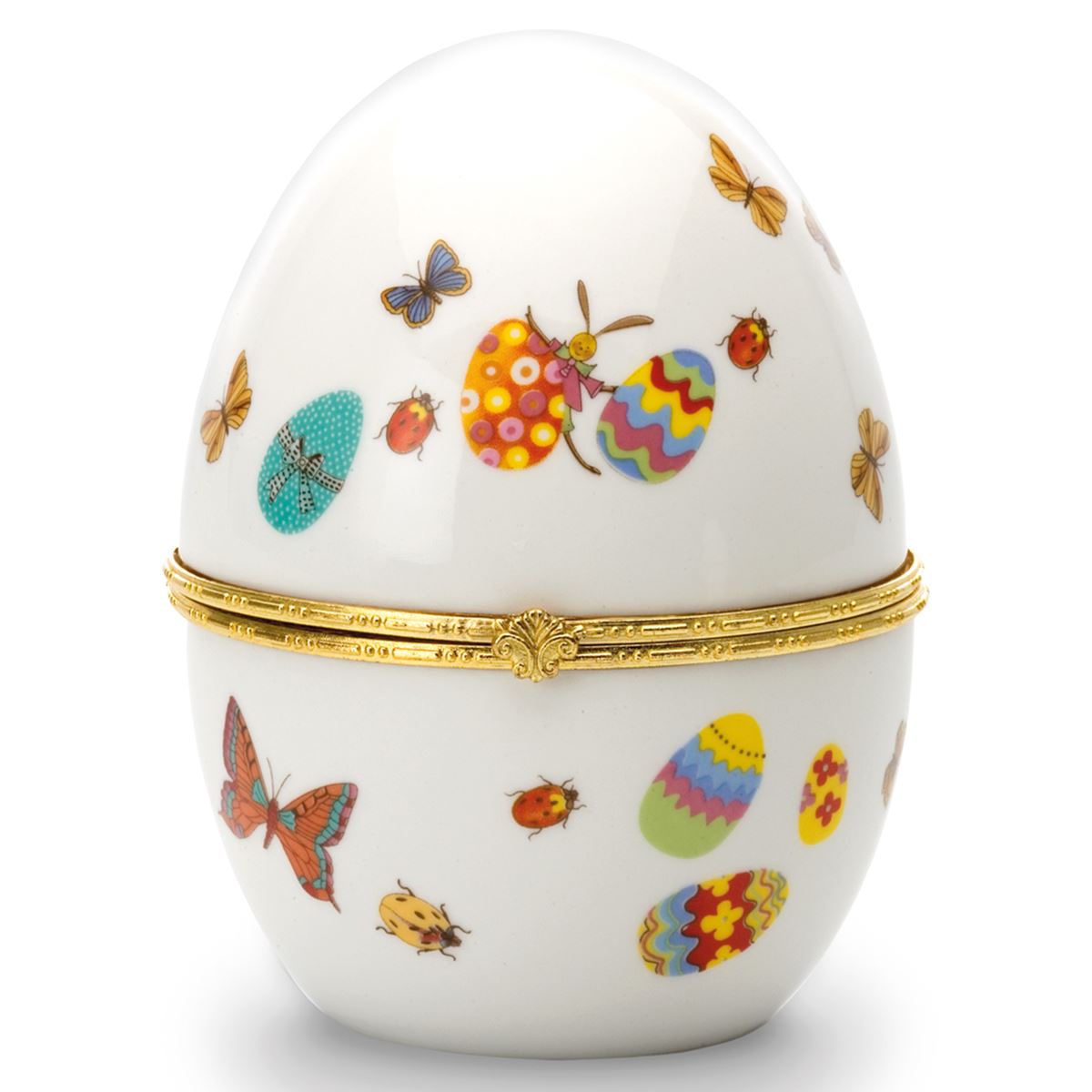 • Höhe ca.: 12 cm • Durchmesser ca.: 10 cm • Material: Porzellan • Veredelung: vergoldet • Oberfläche: glatt • Oberfläche Details: bedruckt • spülmaschinengeeignet: nein • Farbe: weiss, bunt • Eigenschaft: ohne Füße • Ausstattung: Deckel mit Scharnier • Funktionalität: Zum Dekorieren - aufklappbar & befüllbar • Platzierungsart: zum Aufstellen • Form: Ei-förmig • Dimension: groß • Motiv: Eier & Käfer • Motiv-Design: Osterdekor mit Frühlingsakzenten • Symbolik: Symbol für Fülle, Kostbarkeit & festliche Frühlingsfreude • Look & Stil: Opulent, farbenfroh, detailreich, dekorativ, charmant • Umgebungsnutzung: Nur für Innenbereich • Anlass: Für Wohndeko, Präsentation, Geschenk, Sammlung, Frühling • Nutzungsbereich: Vitrine, Kommode, Sideboard, Schlafzimmer, Regal, Empfang • Nutzungsmöglichkeit: Objekt platzieren, Tisch dekorieren, Raum optisch ergänzen • Besonderheit: Nicht für gewöhnliche Frühstückseier nutzbar! • Gewicht ca.: 0,349 Kg