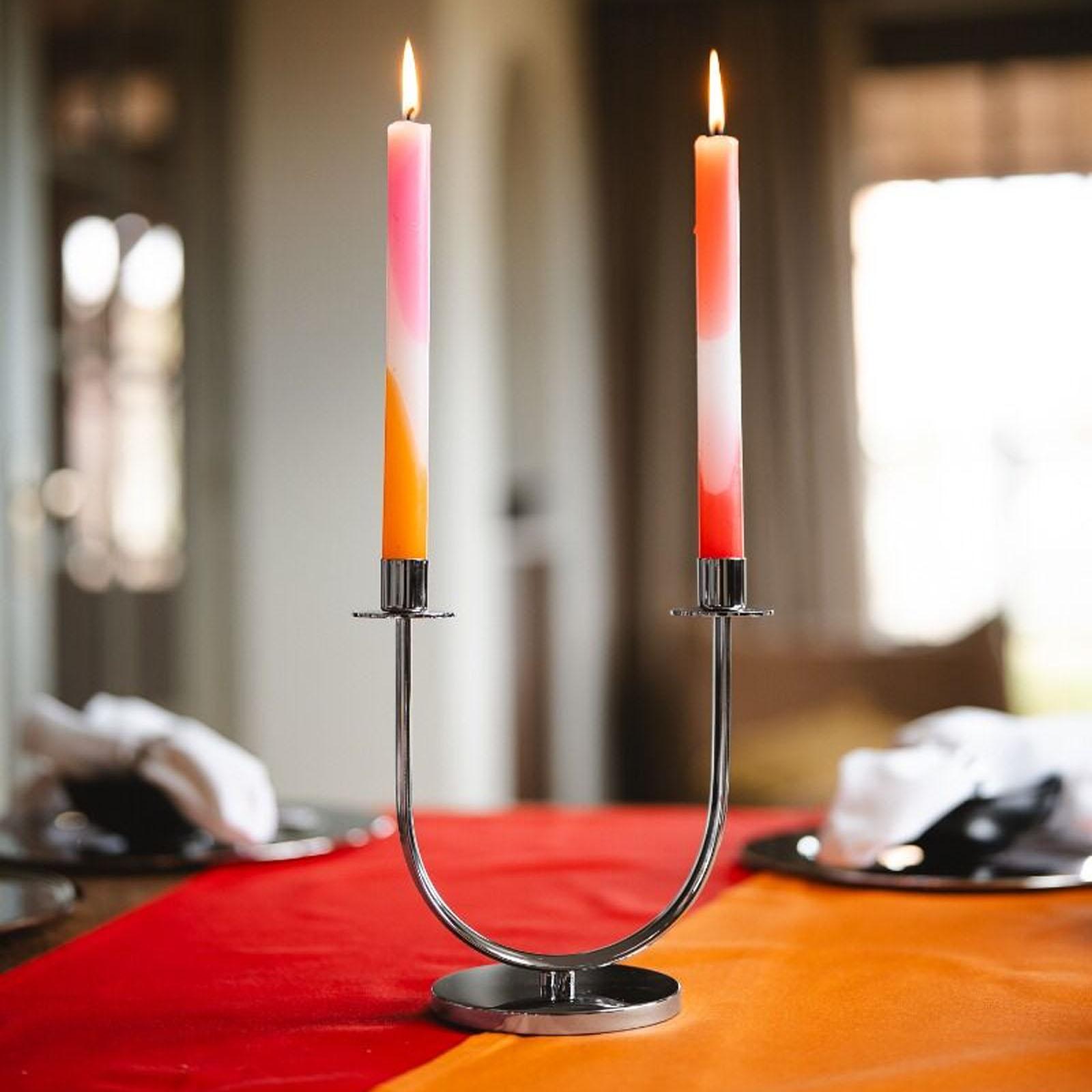 ✓ Das zweiarmige Design bietet Platz für zwei Stabkerzen und sorgt für ausgewogene Lichtwirkung ✓ Die sanft geschwungene Form verleiht dem Kerzenhalter eine moderne & elegante Ausstrahlung ✓ Die Glanz-Metalloberfläche des Kerzenständers reflektiert das Kerzenlicht & setzt schöne Akzente ✓ Die stabile Verarbeitung des Leuchters sorgt sicheren Stand auf Tisch, Sideboard und Fensterbank ✓ Mit einer Maße von 9,5 x 22 x 20,9 cm ist der 2-flammige Halter für Stabkerzen vielseitig einsetzbar